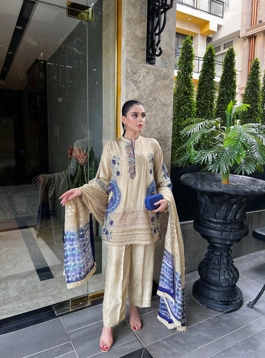 A stunning blend of muted elegance and bold, jewel-toned embroidery. Crafted from soft, light golden...