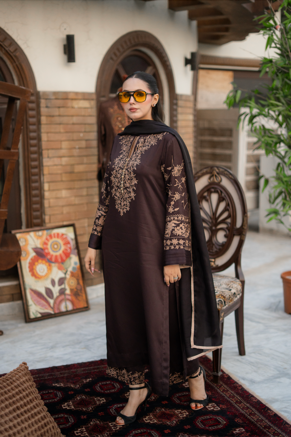 Cocoa Royale is crafted in luxurious Shamose Marina, featuring intricate Ari embroidery that adds depth...