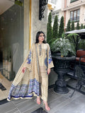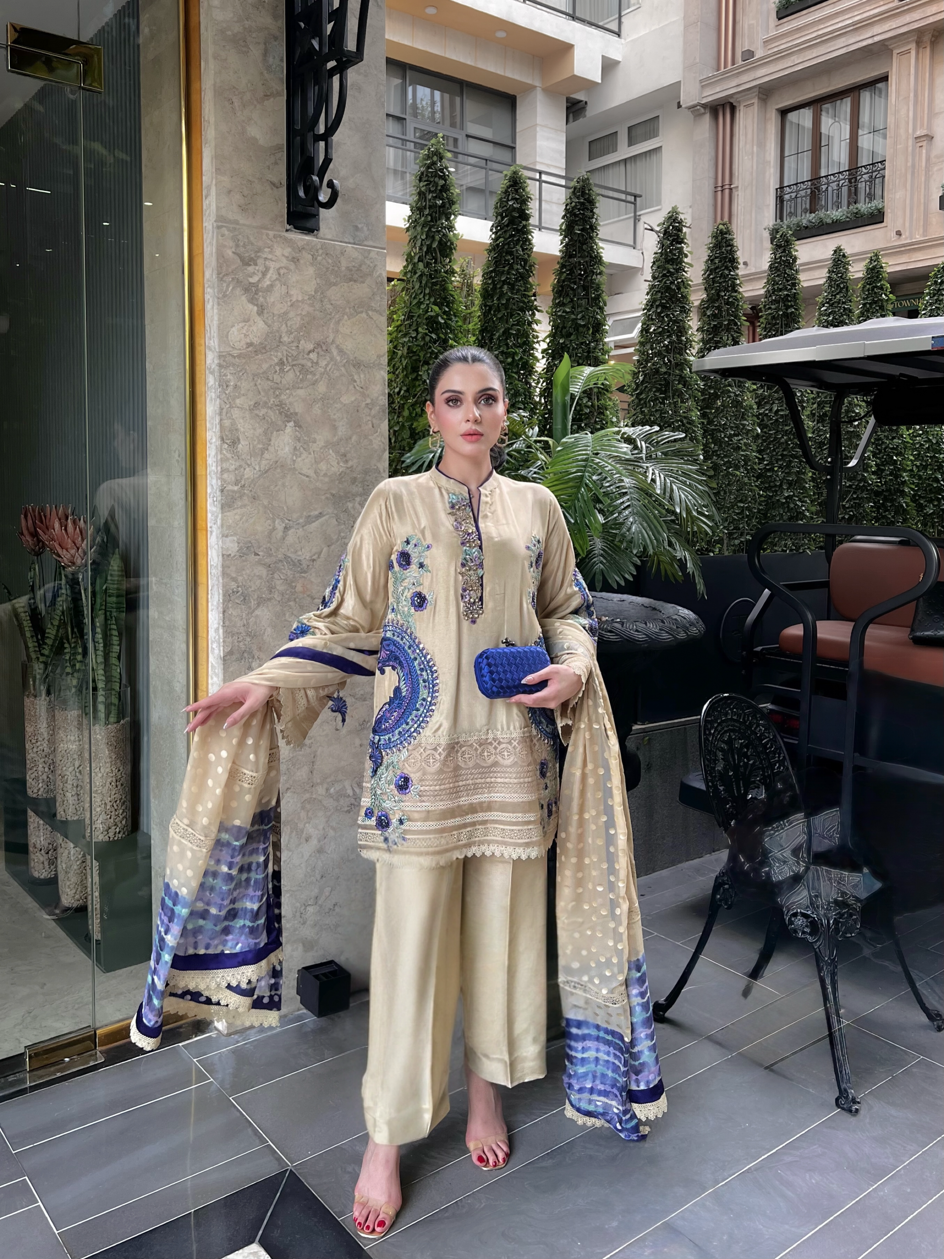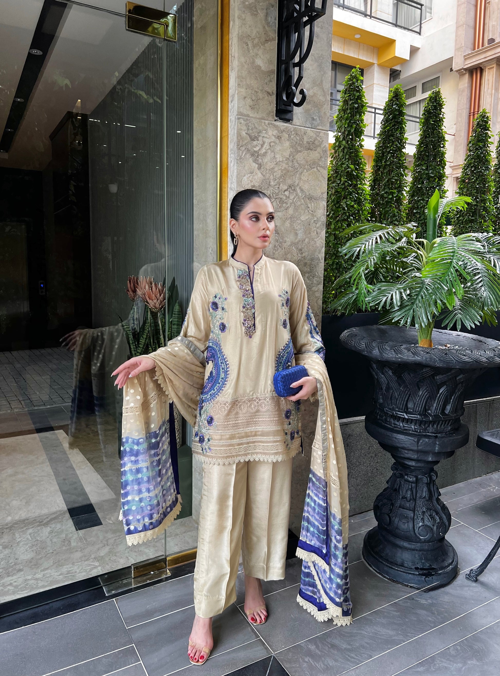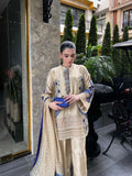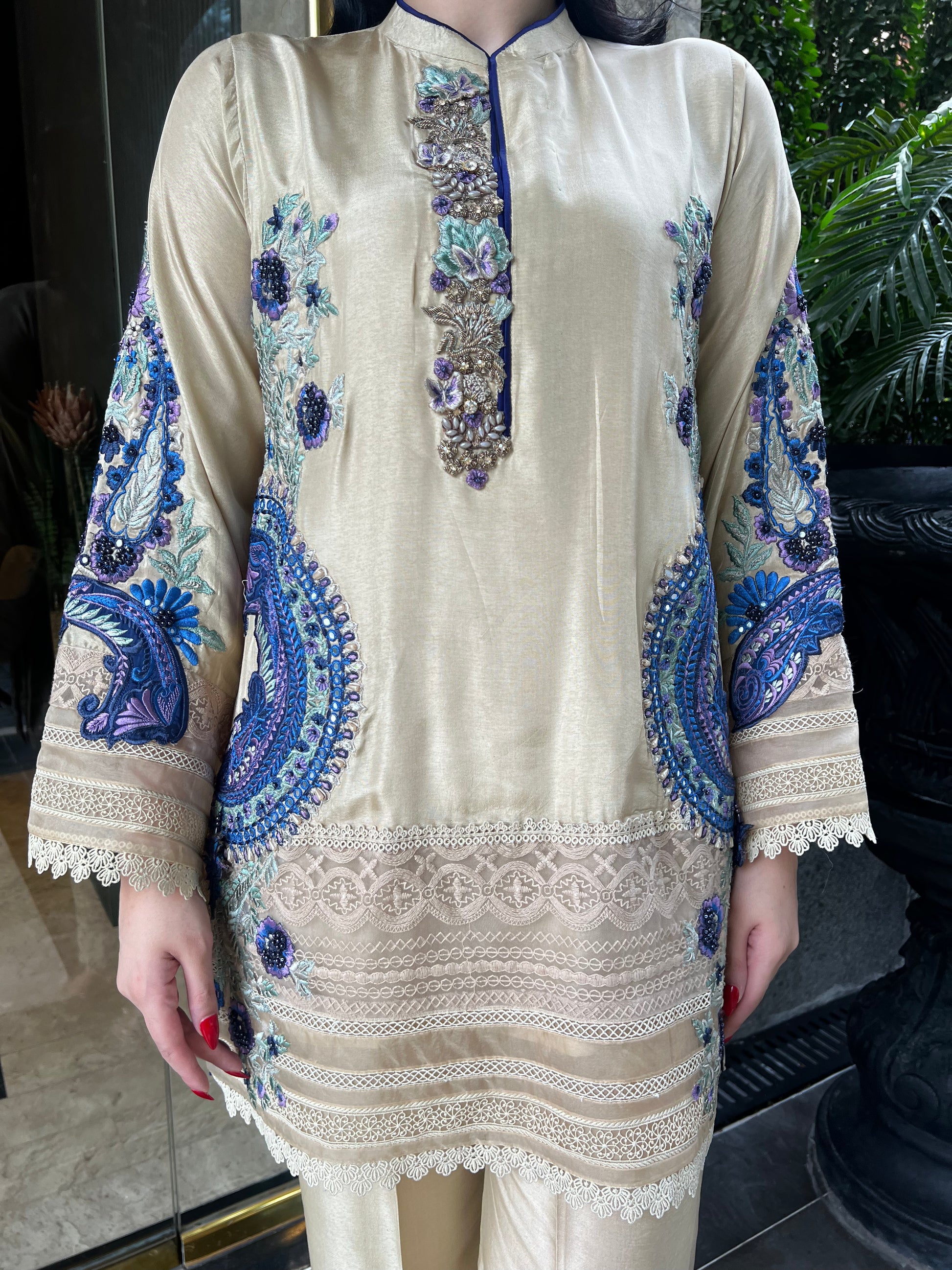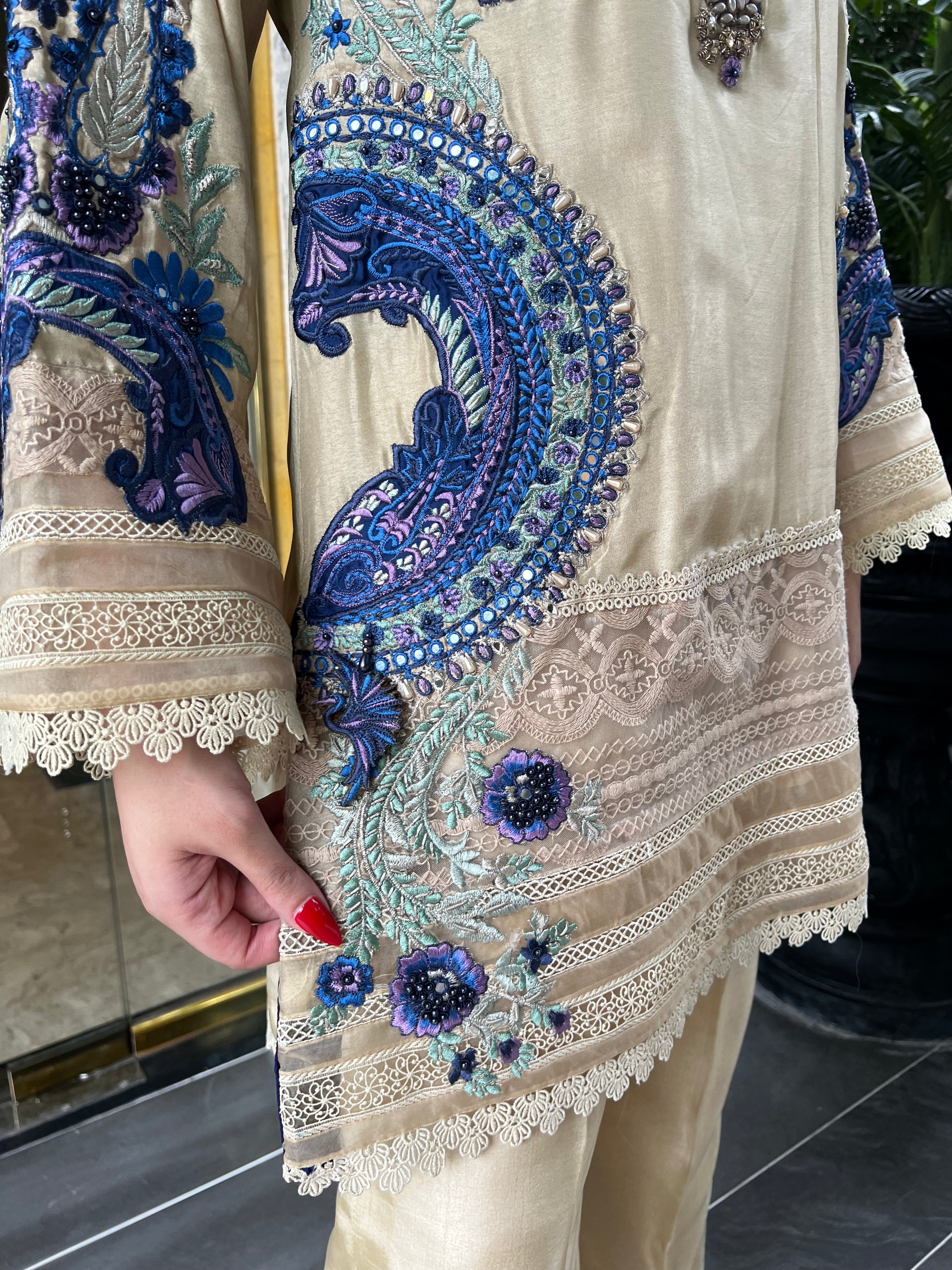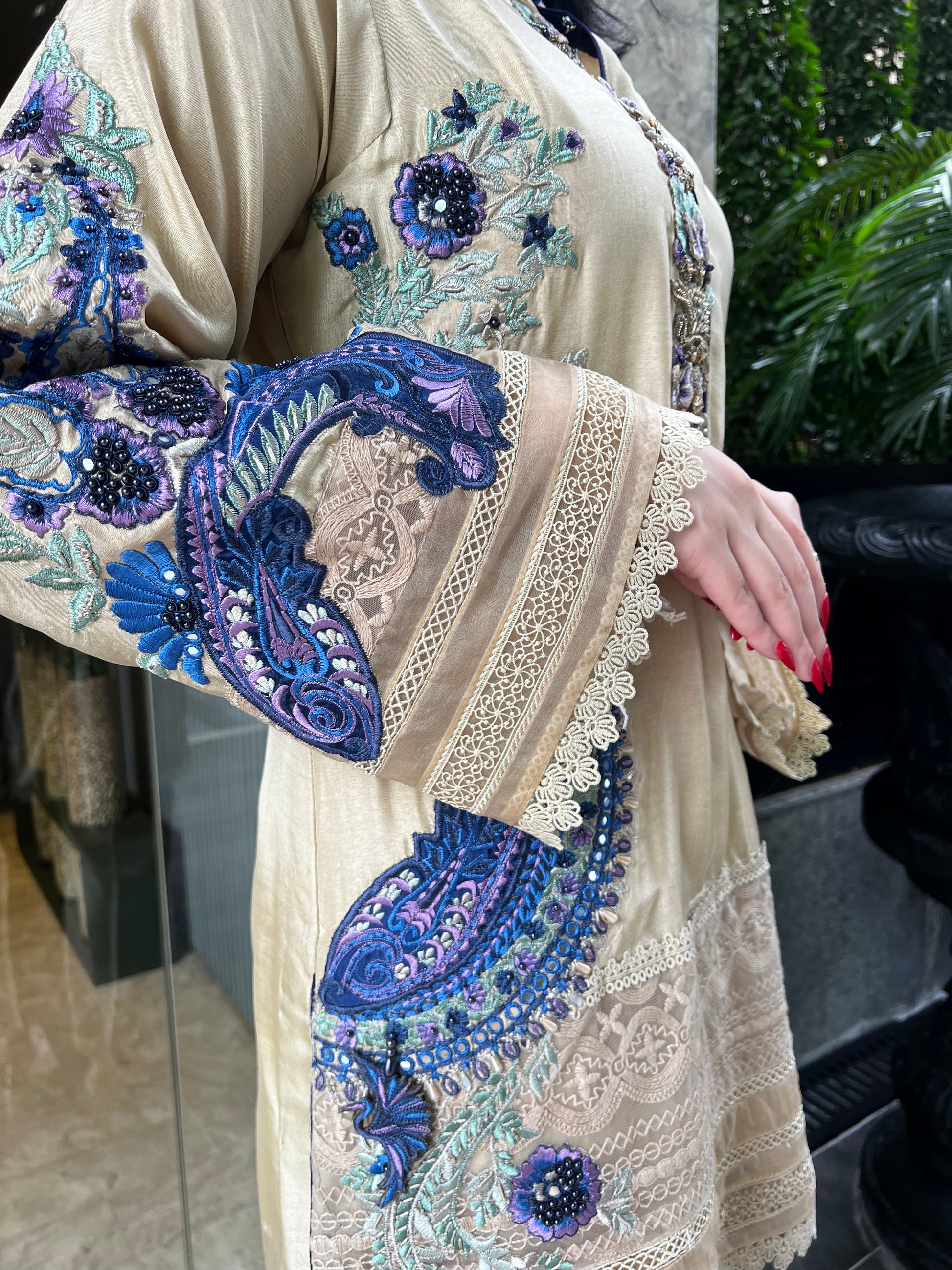 Radiating understated luxury, Butter Cup Lace is a vision of timeless charm crafted on tassel silk — a fabric that flows with soft grace and subtle sheen. The outfit features exquisite ari and thread embroidery in shades of deep sapphire, lilac, and mint, forming ornate floral and paisley motifs that dance across the shirt front and sleeves.
