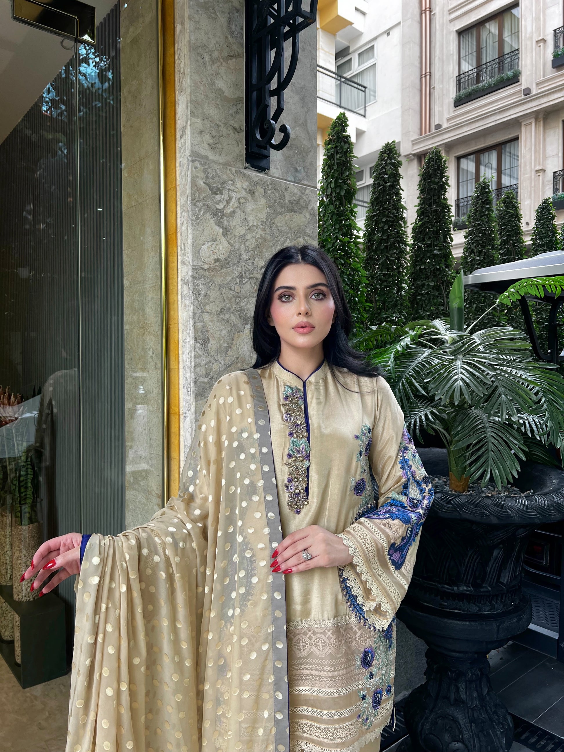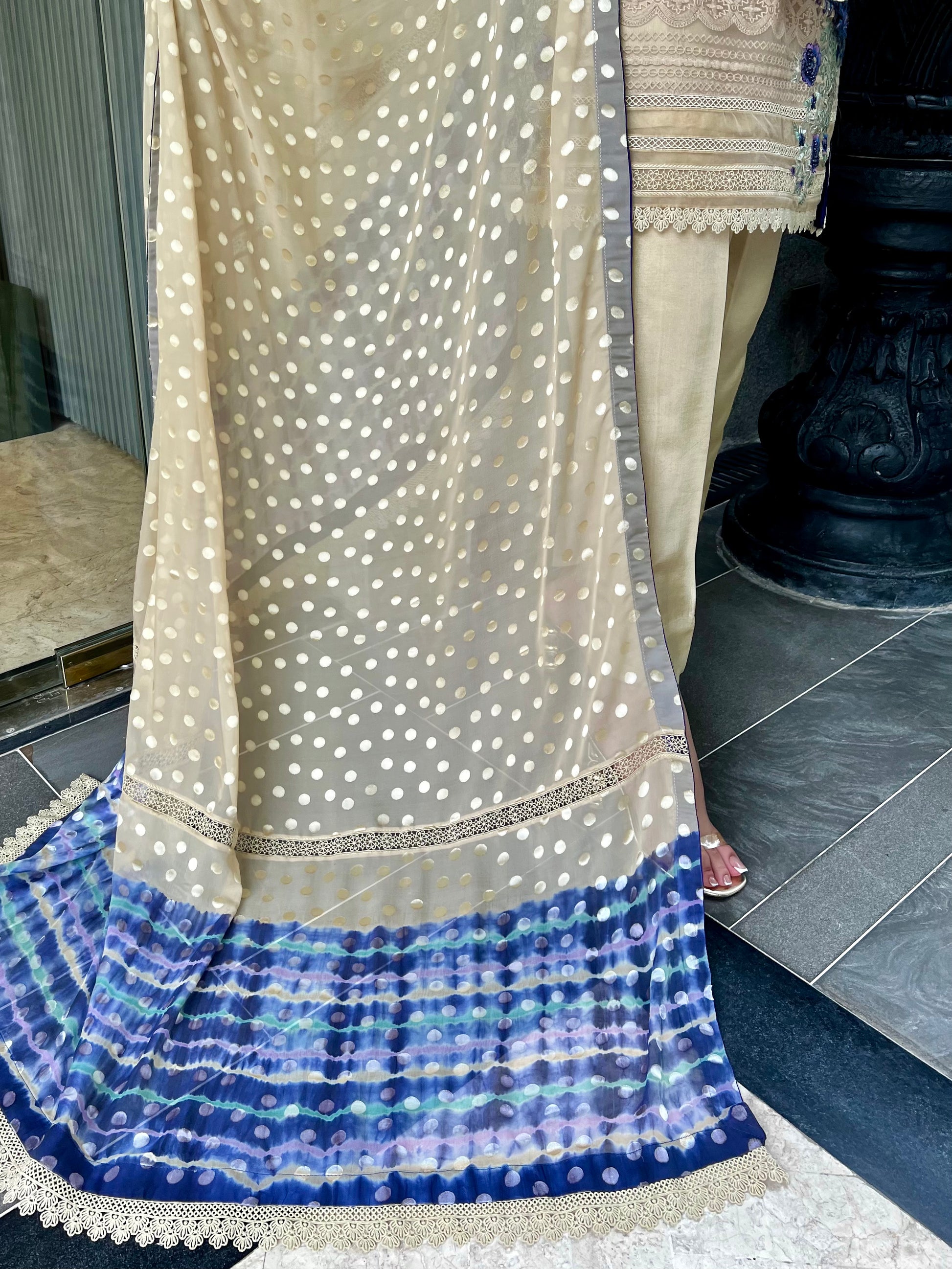 Paired with matching silk trousers and a chiffon dupatta, softly tasselled and dotted with polka embroidery blending into a sapphire-toned gradient, this design is an ode to elegant craftsmanship and serene sophistication — perfect for festive soirées or evening gatherings