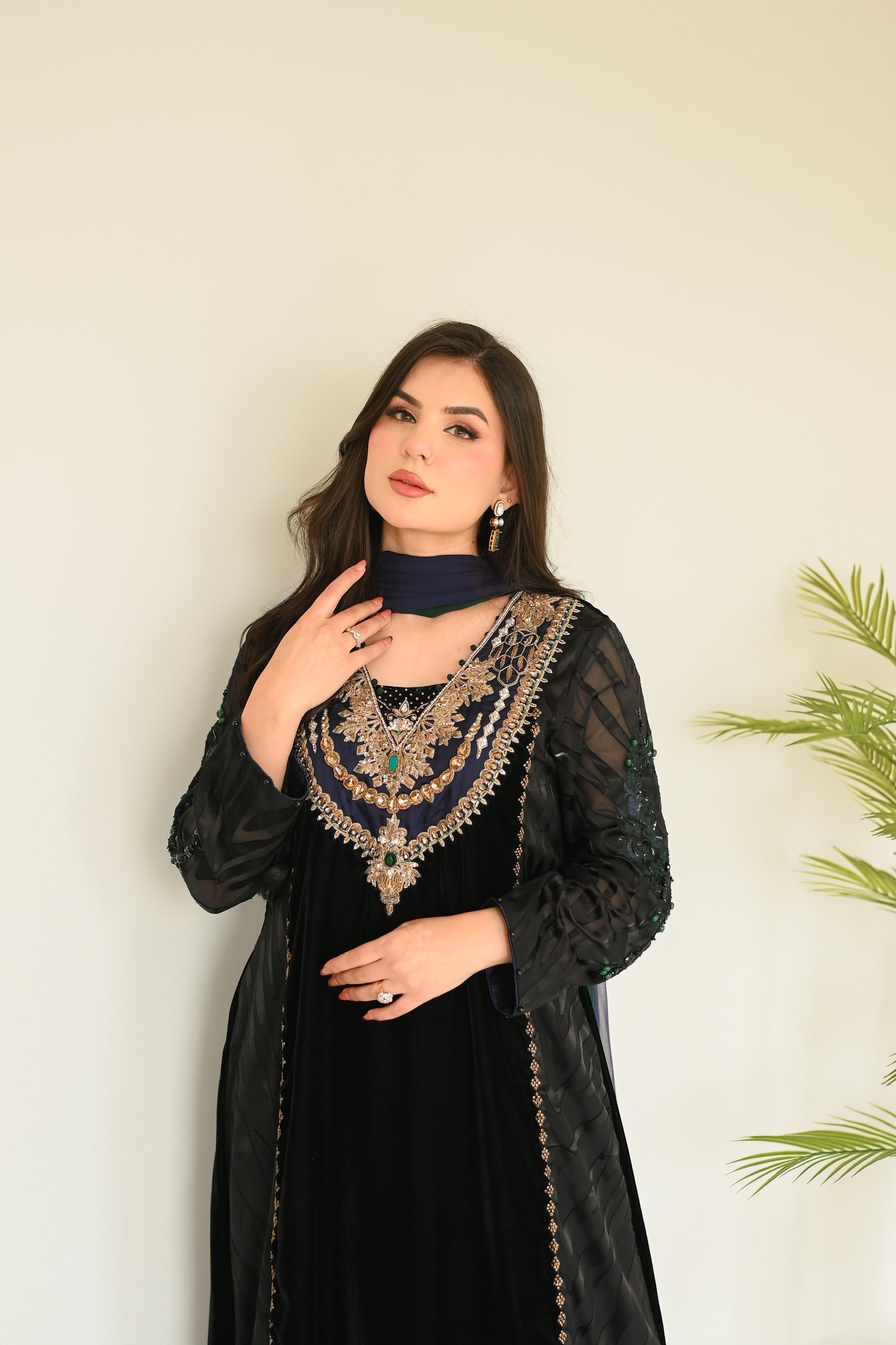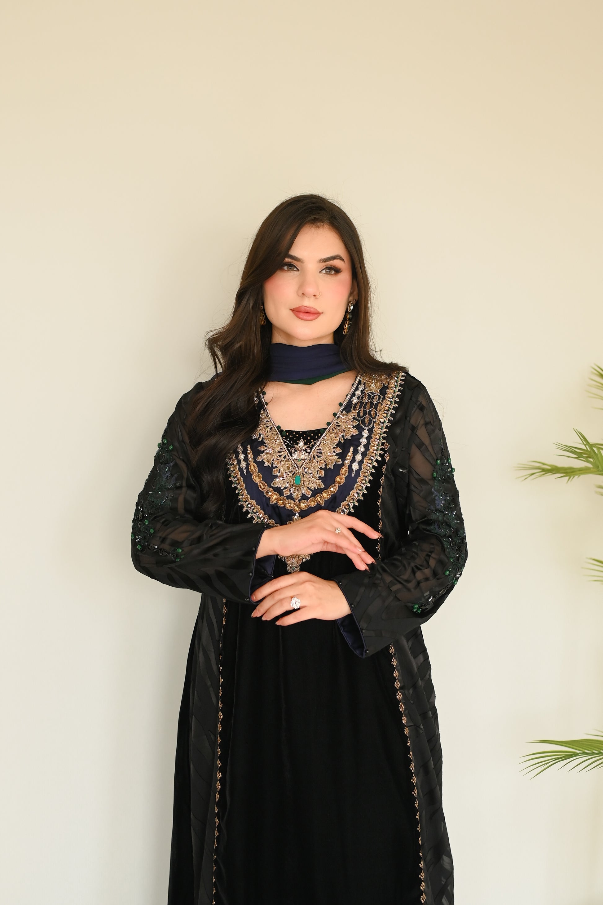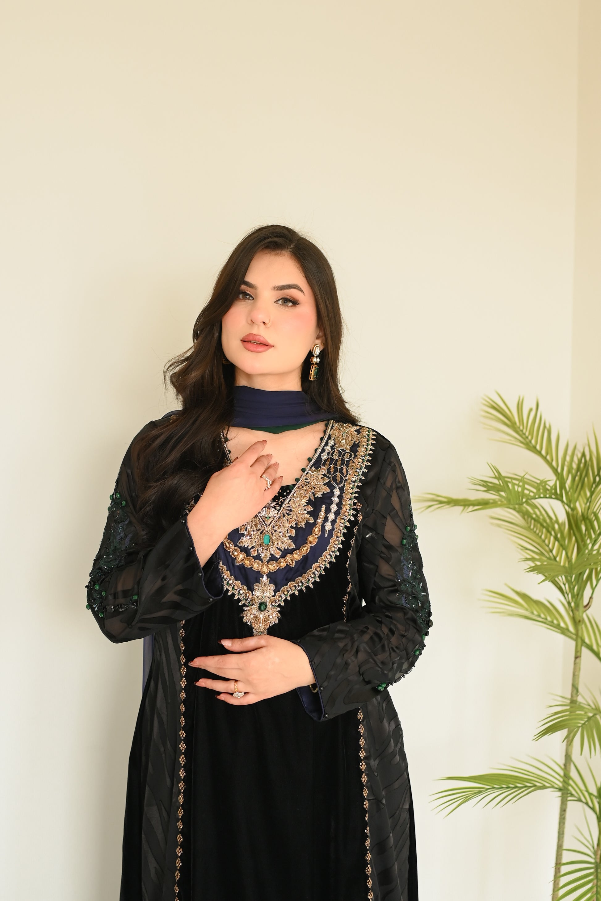 Final Luxury Listing Crafted in rich, plush velvet, Emerald Crown is a statement of regal elegance and timeless charm. The ensemble features delicate brosia chiffon sleeves and panels, creating a graceful contrast against the bold velvet base. Intricate Ari handwork on the sleeves highlights fine artisanal craftsmanship.