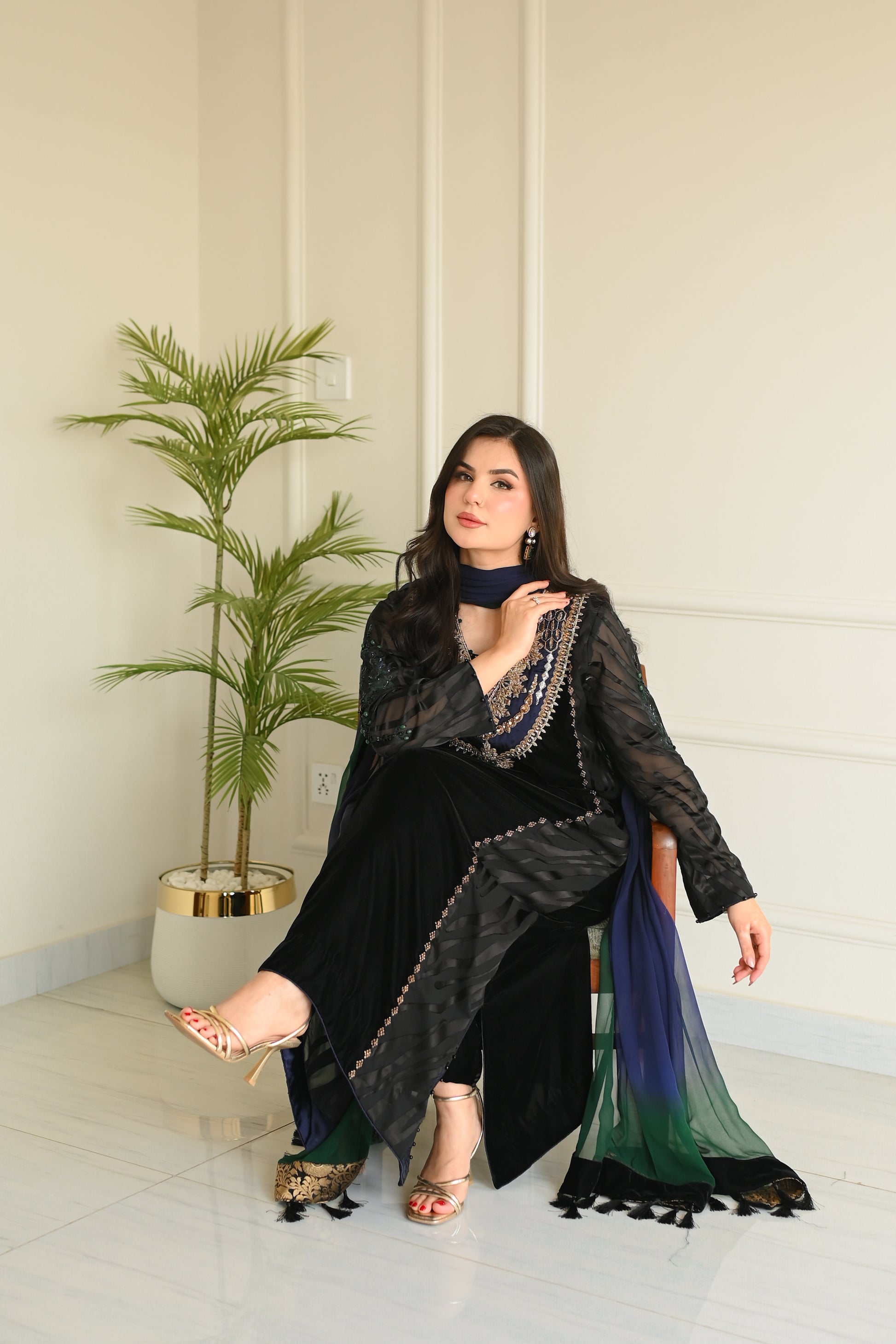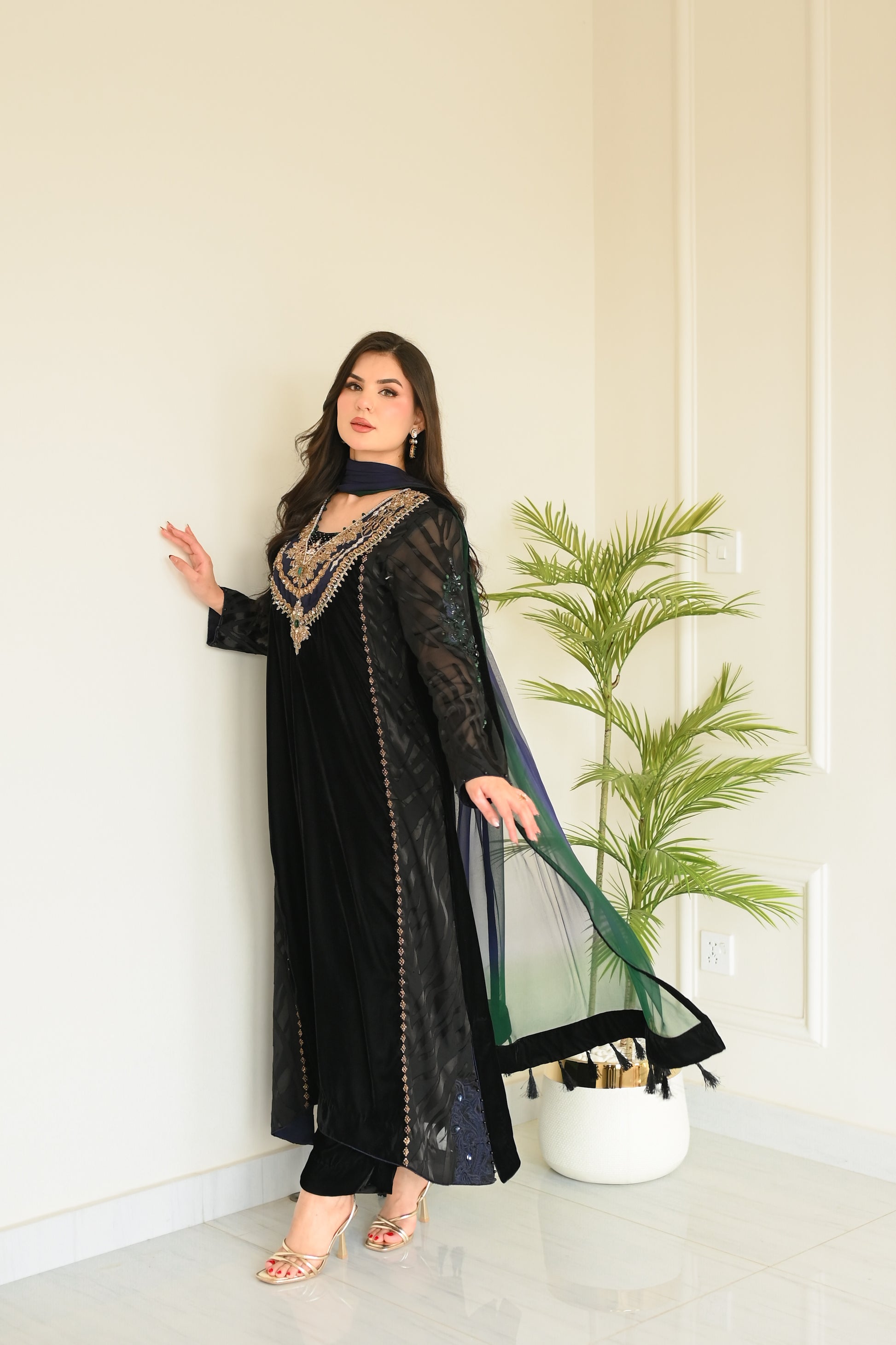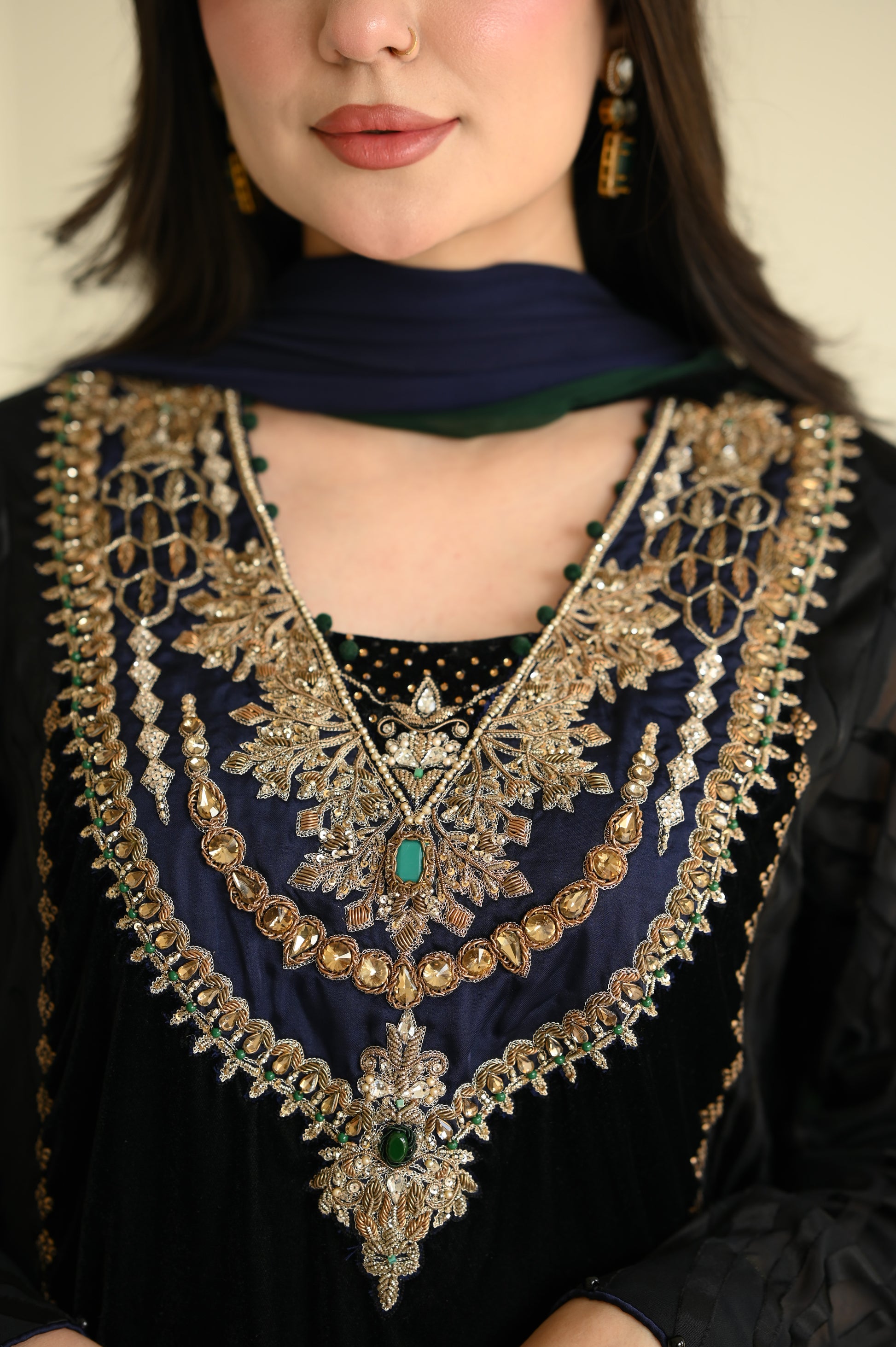 Final Luxury Listing Crafted in rich, plush velvet, Emerald Crown is a statement of regal elegance and timeless charm. The ensemble features delicate brosia chiffon sleeves and panels, creating a graceful contrast against the bold velvet base. Intricate Ari handwork on the sleeves highlights fine artisanal craftsmanship.