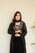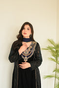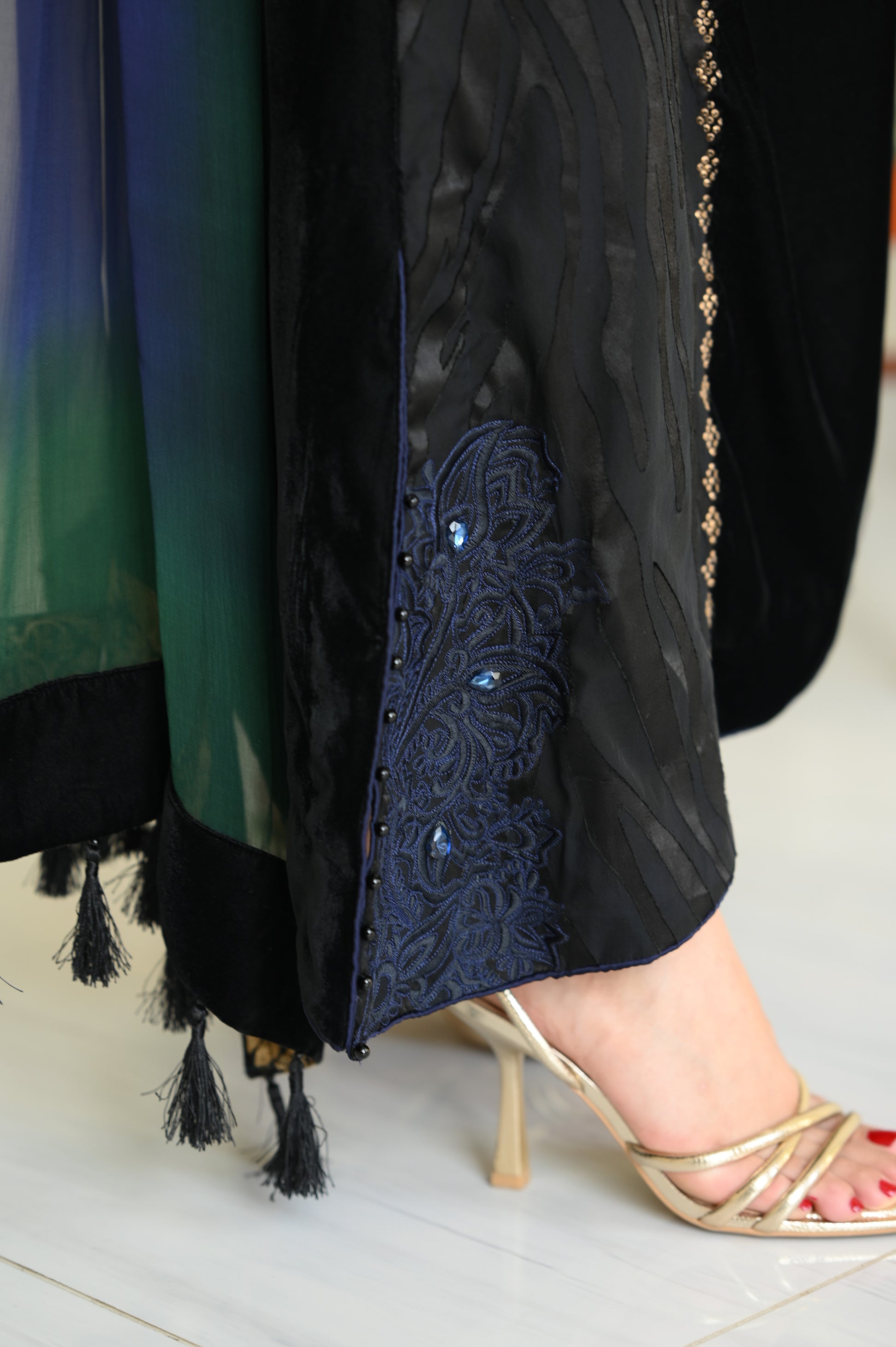 The silhouette is enhanced with thread-detailed gathers, while carefully placed sapphire stones add a subtle, jewel-like sparkle. Completing the look is a flowy chiffon dupatta, finished with elegant tassels that add movement, softness, and a touch of royal drama.