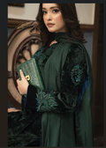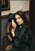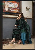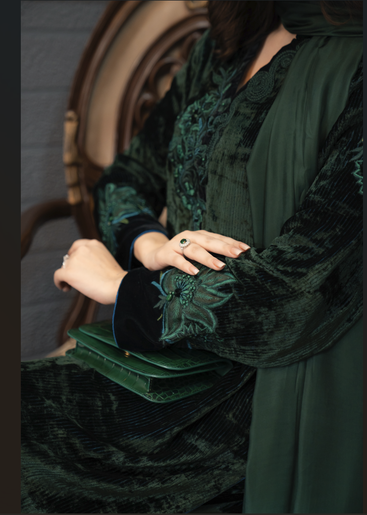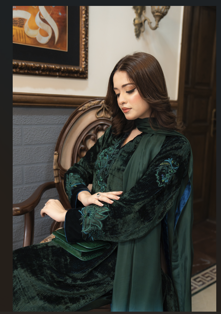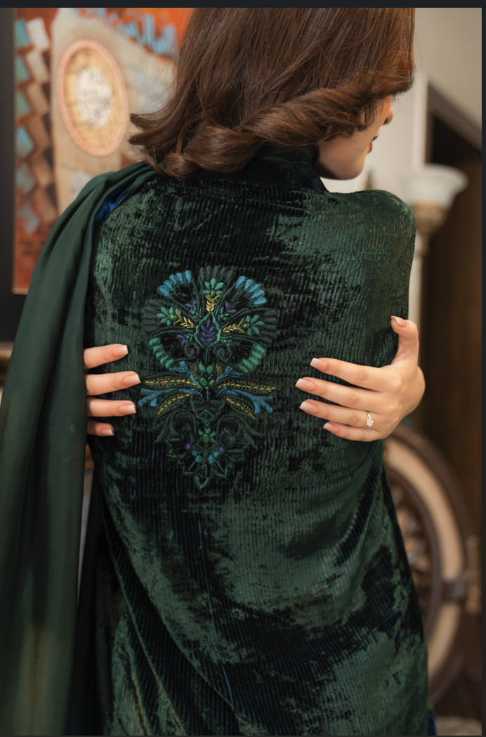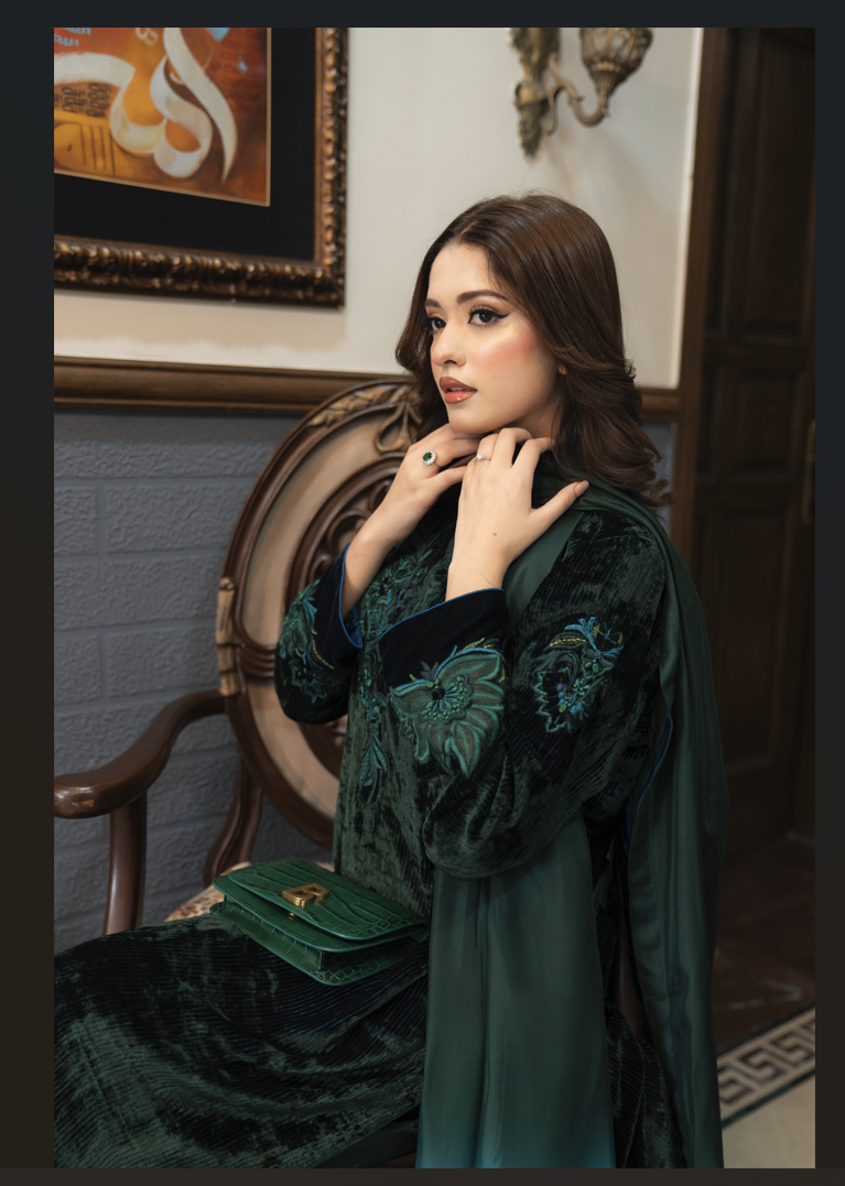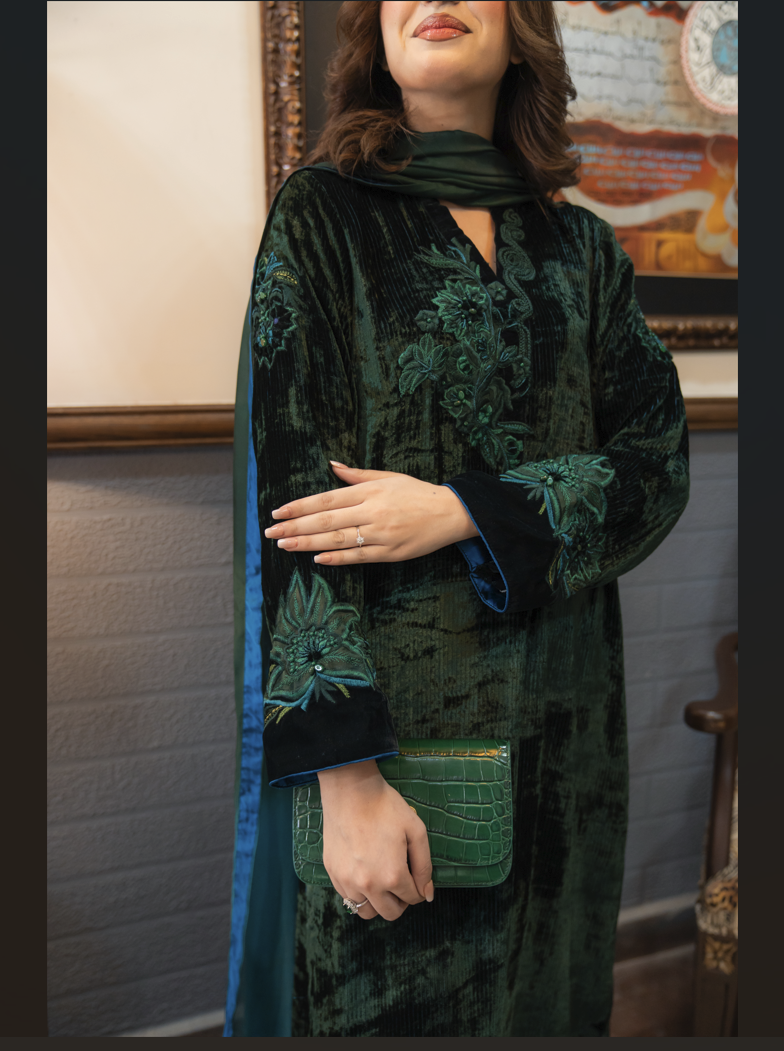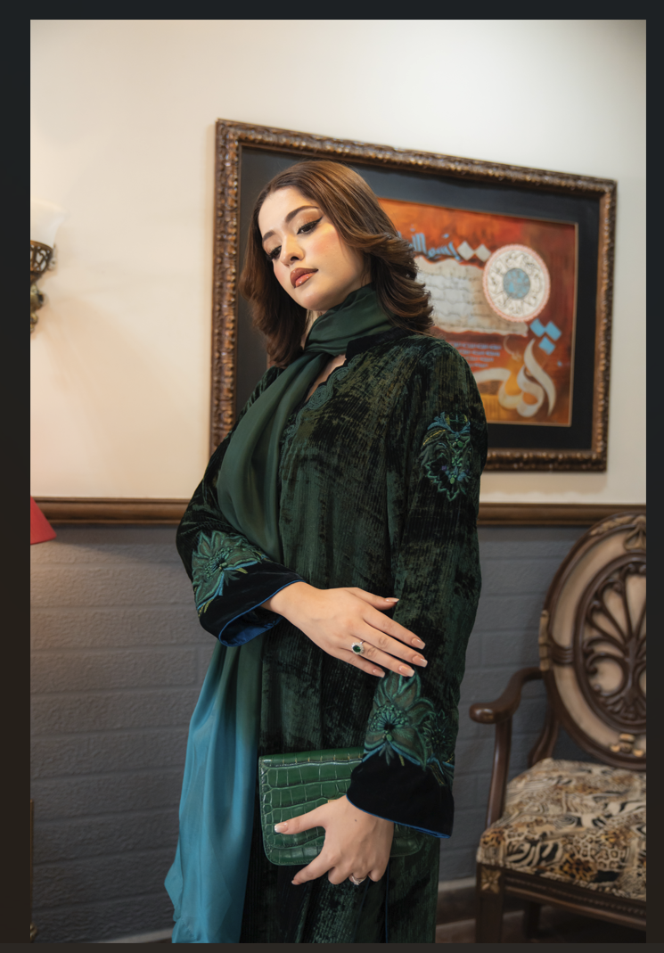 Wrapped in rich, deep forest tones, this corduroy velvet ensemble brings warmth, depth, and quiet sophistication to the season. The plush velvet texture adds a soft, luxurious drape, while the embroidered sleeve detailing introduces a subtle touch of artistry. Paired with a fluid silk dupatta that transitions in tone, the outfit moves gracefully — offering both comfort and statement presence. Perfect for evening gatherings, winter dinners, and intimate festive moments — this piece is where timeless style meets effortless coziness.