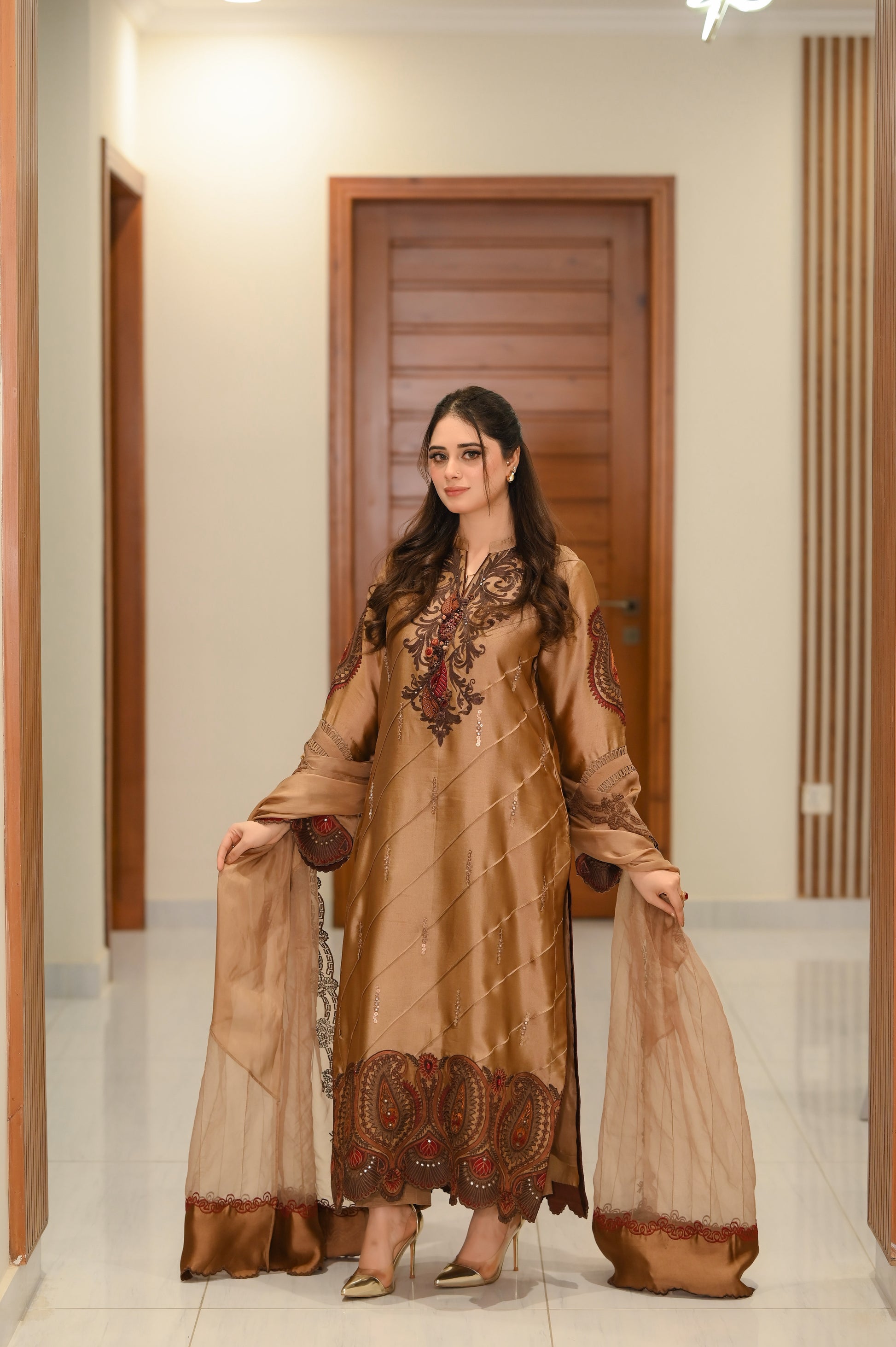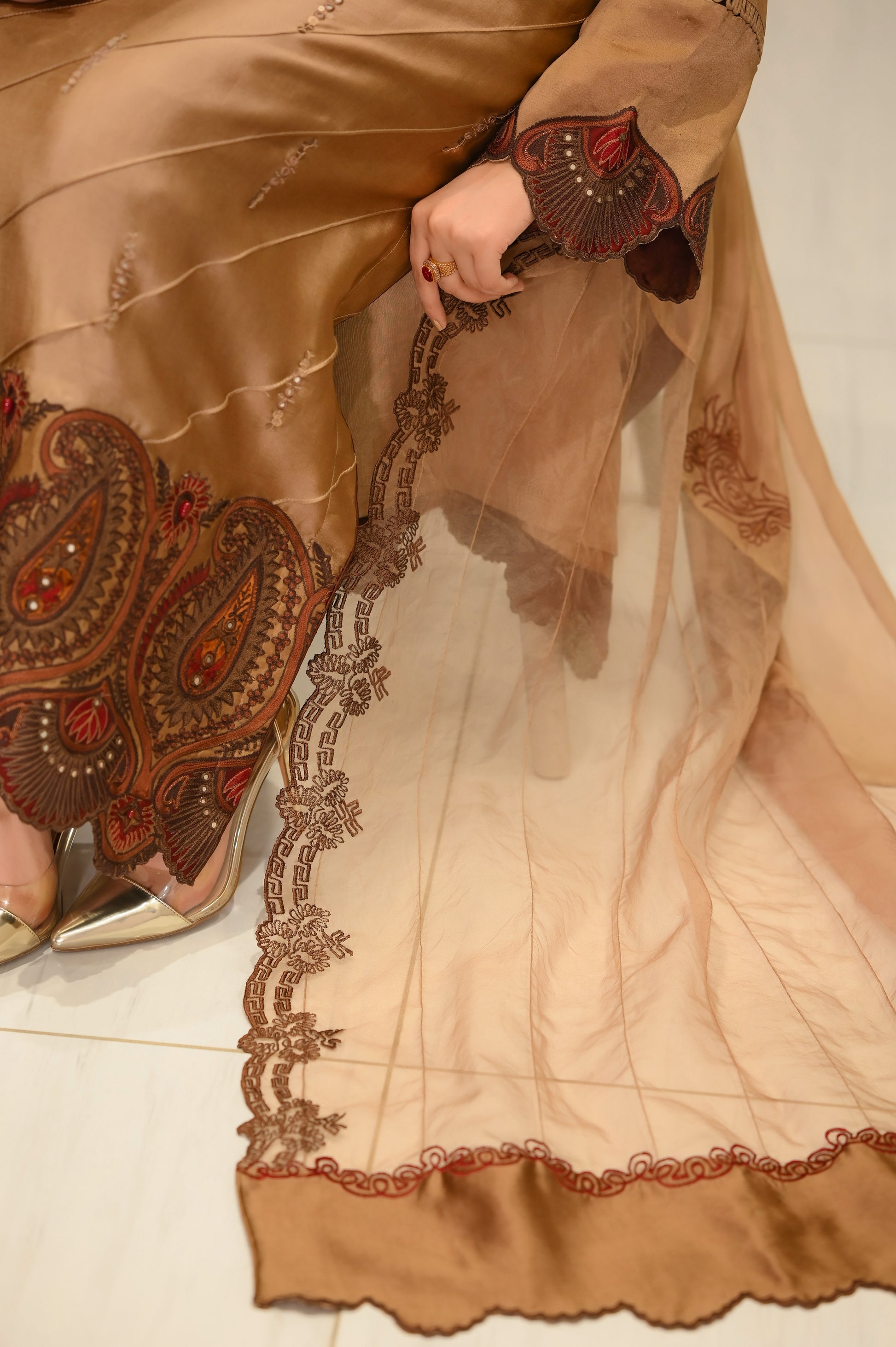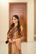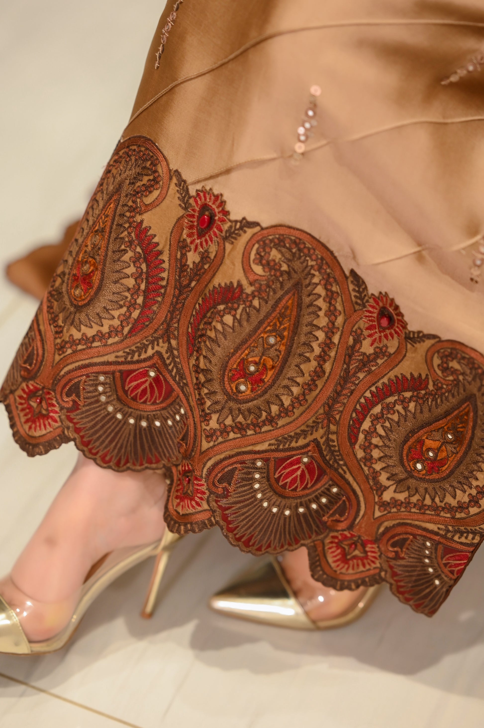 Golden Dusk is a regal ensemble crafted with meticulous attention to detail, featuring full ivory embroidered borders that define the silhouette with timeless elegance. The outfit is elevated by fine pintex detailing across the front, sleeves, and neckline, creating subtle texture and depth throughout. The handcrafted neckline stands out with intricate zardozi work, delicate pinch knots, and refined muse-style embellishment, reflecting heirloom craftsmanship. The sleeves are adorned with ornate ivory motifs, adding a touch of artistry and balance to the design. Completing the look is a multi-fabric dupatta, thoughtfully composed with embroidered accents and a hint of miraka, lending soft movement and a luminous finish. Golden Dusk embodies understated royalty, making it ideal for festive occasions and elegant evening wear.