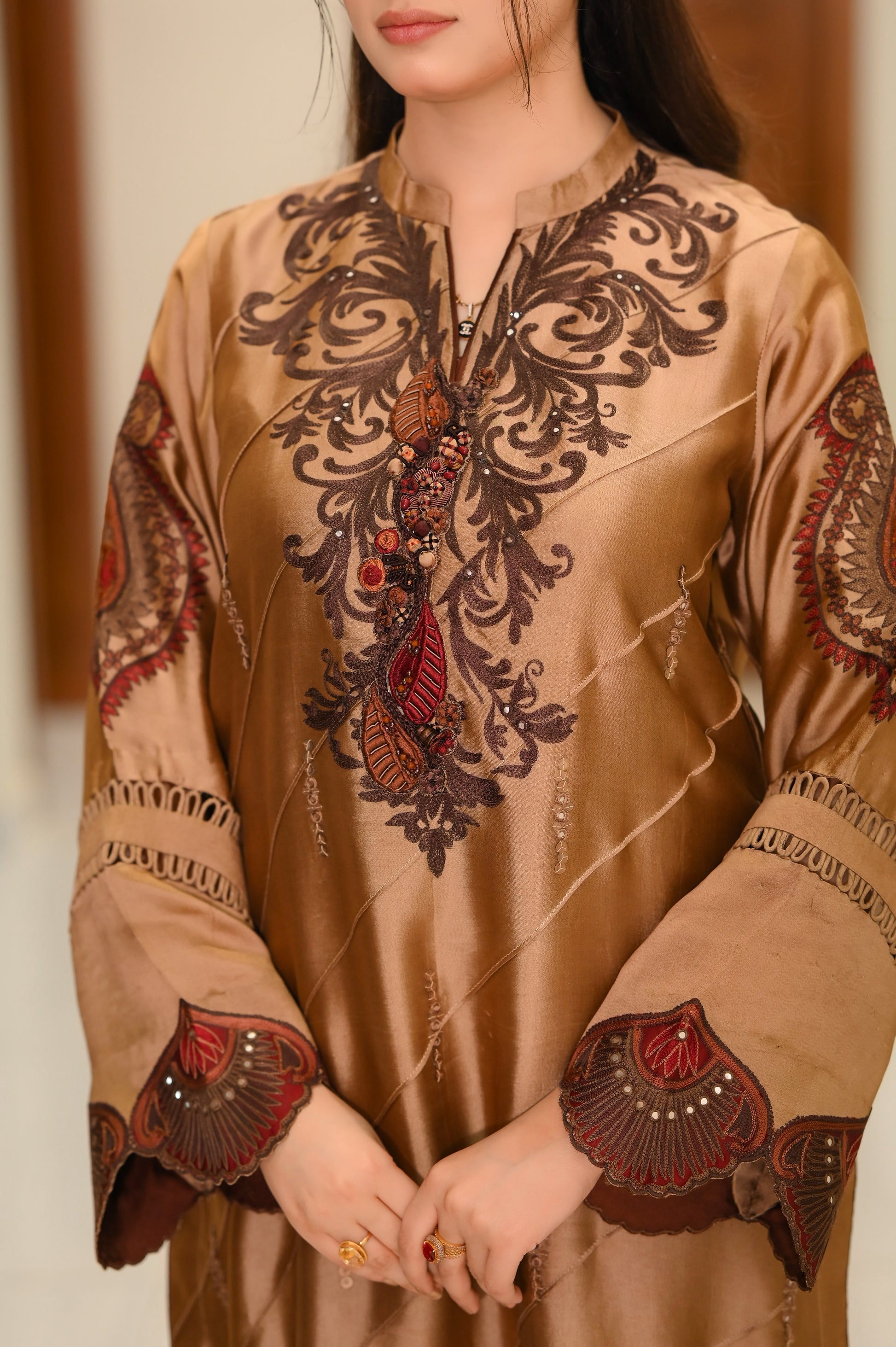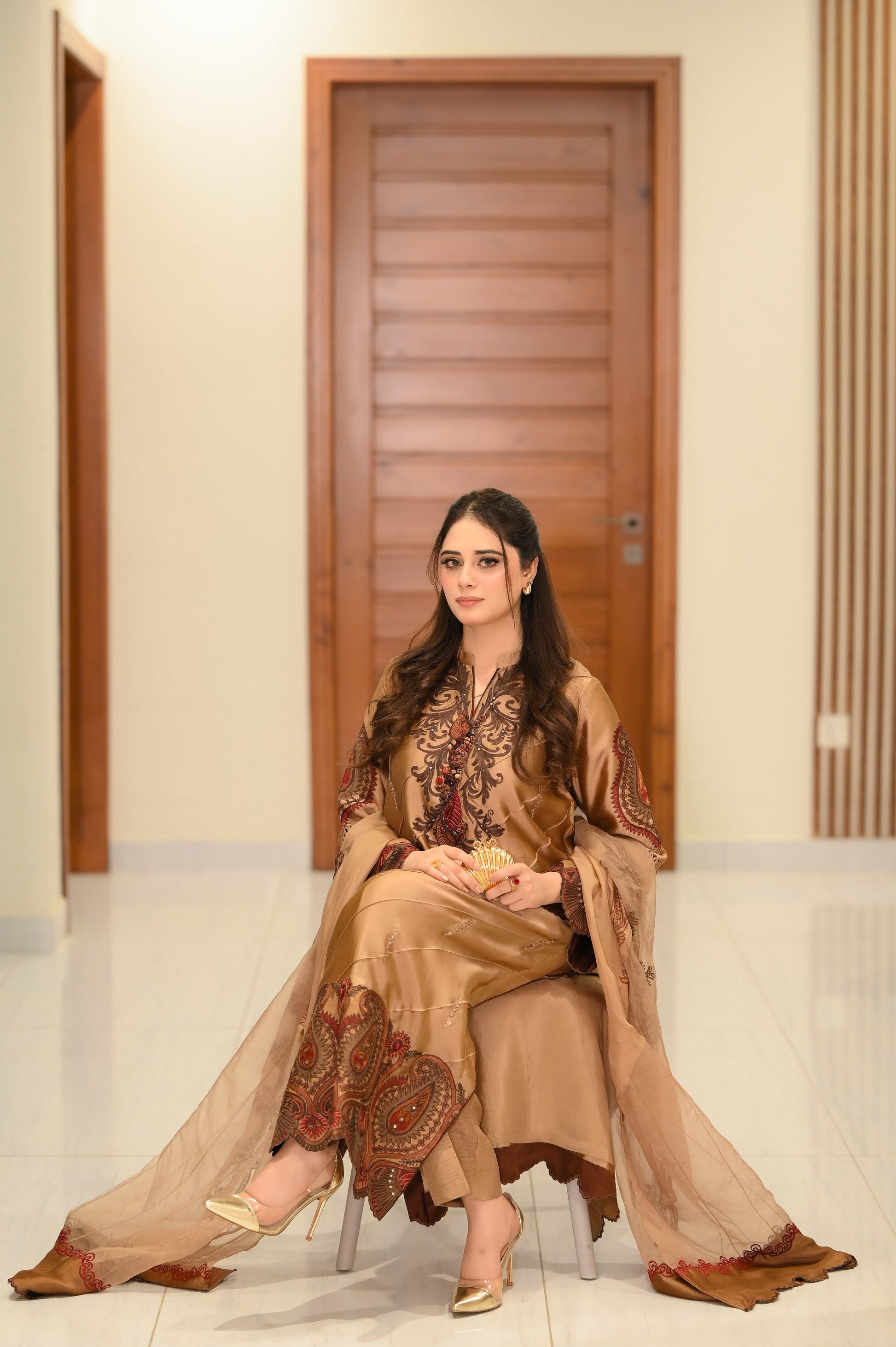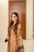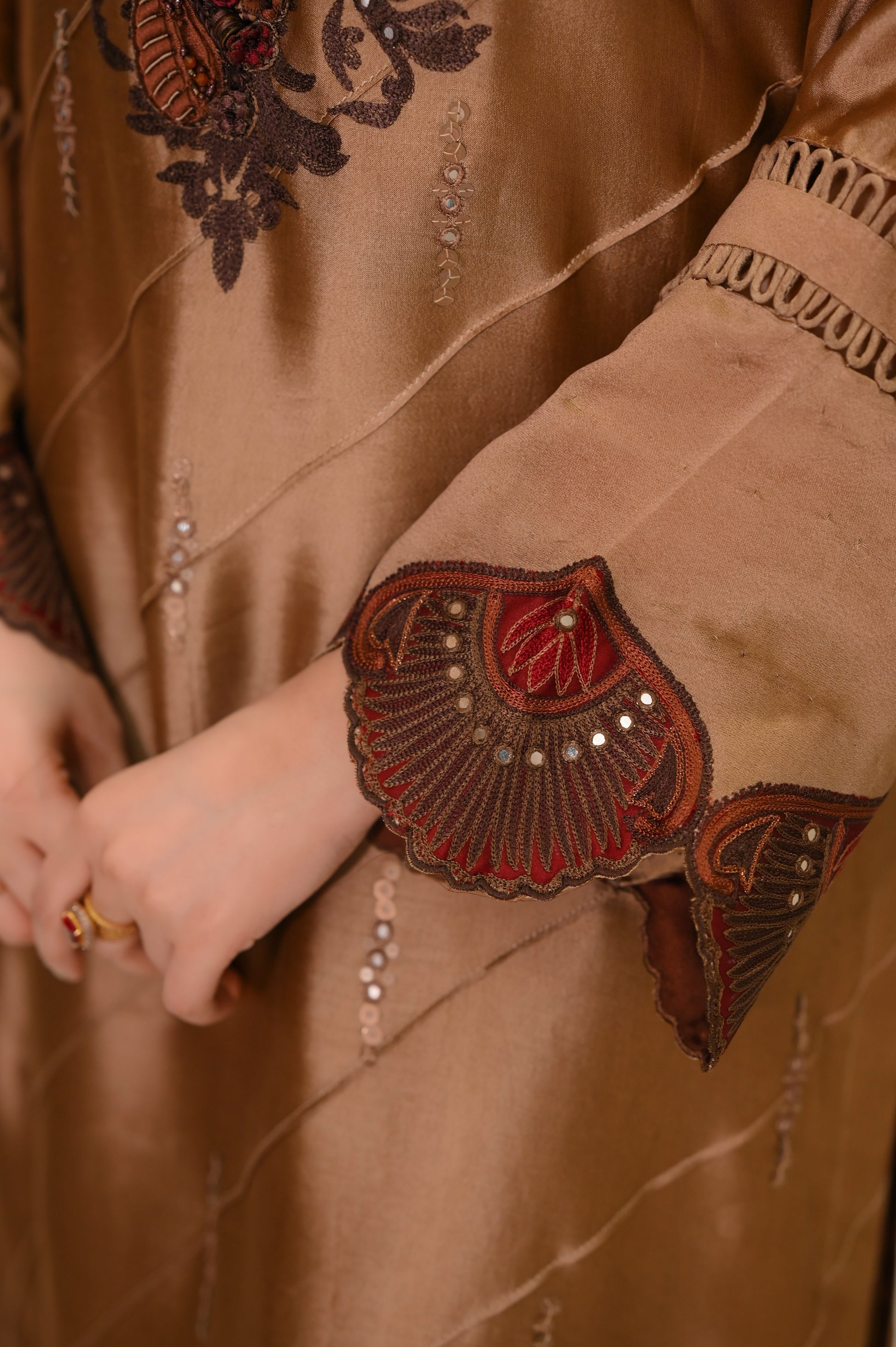 Golden Dusk is a regal ensemble crafted with meticulous attention to detail, featuring full ivory embroidered borders that define the silhouette with timeless elegance. The outfit is elevated by fine pintex detailing across the front, sleeves, and neckline, creating subtle texture and depth throughout. The handcrafted neckline stands out with intricate zardozi work, delicate pinch knots, and refined muse-style embellishment, reflecting heirloom craftsmanship. The sleeves are adorned with ornate ivory motifs, adding a touch of artistry and balance to the design. Completing the look is a multi-fabric dupatta, thoughtfully composed with embroidered accents and a hint of miraka, lending soft movement and a luminous finish. Golden Dusk embodies understated royalty, making it ideal for festive occasions and elegant evening wear.