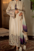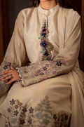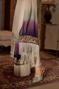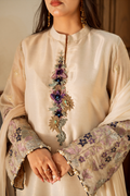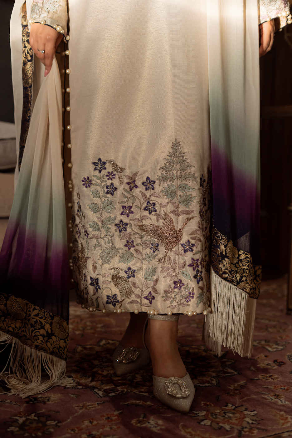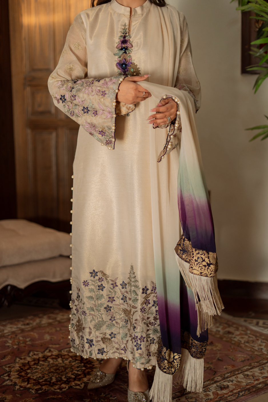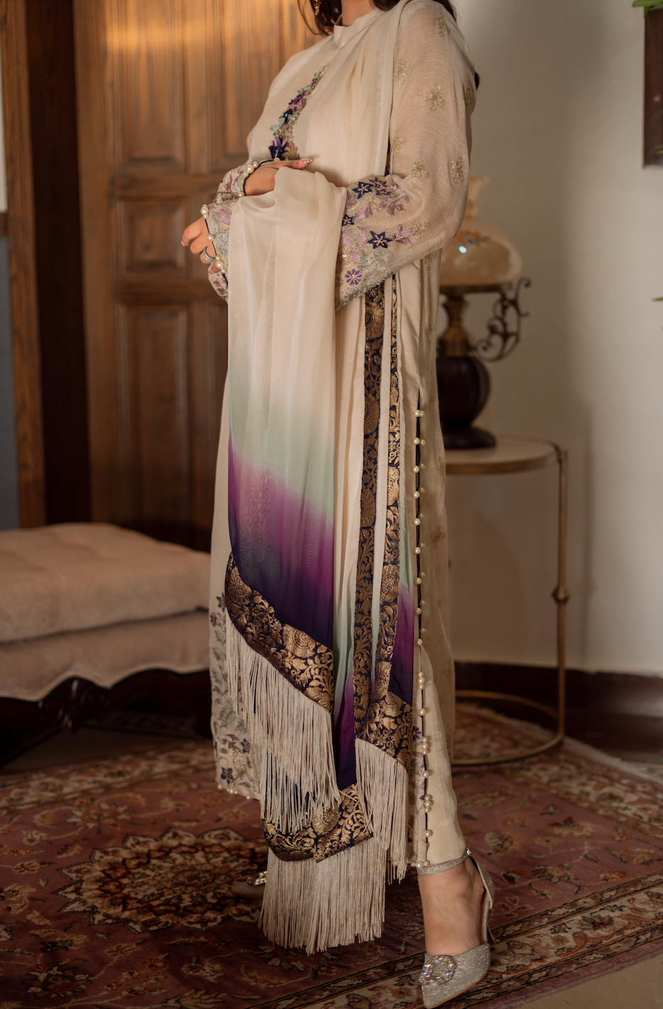 It is paired with sleek Pakistani raw silk trousers for a structured, polished finish. The look is completed with a flowing chiffon dupatta, beautifully finished with jamavar trim and delicate fringe lace, adding a touch of traditional luxury.