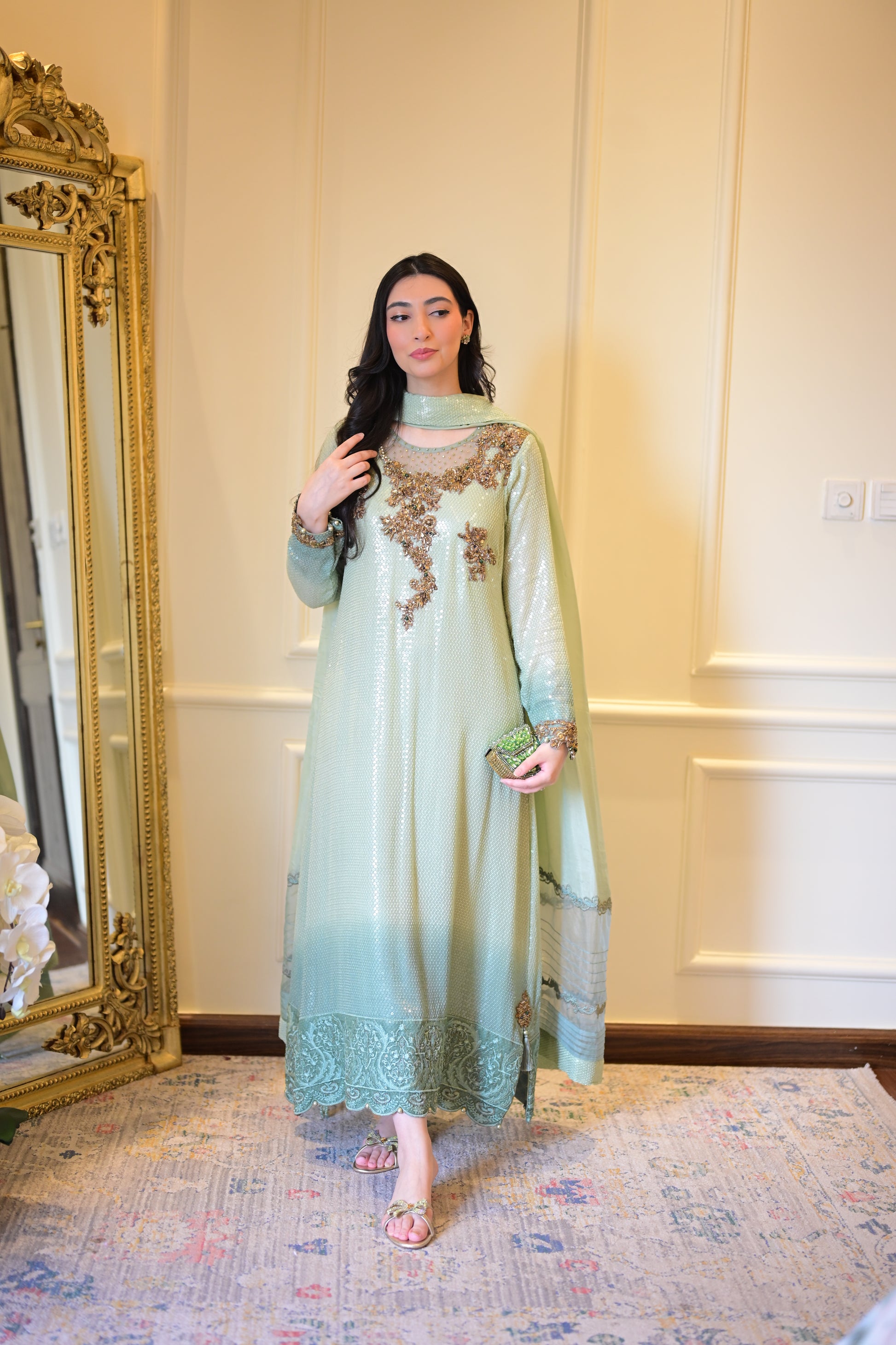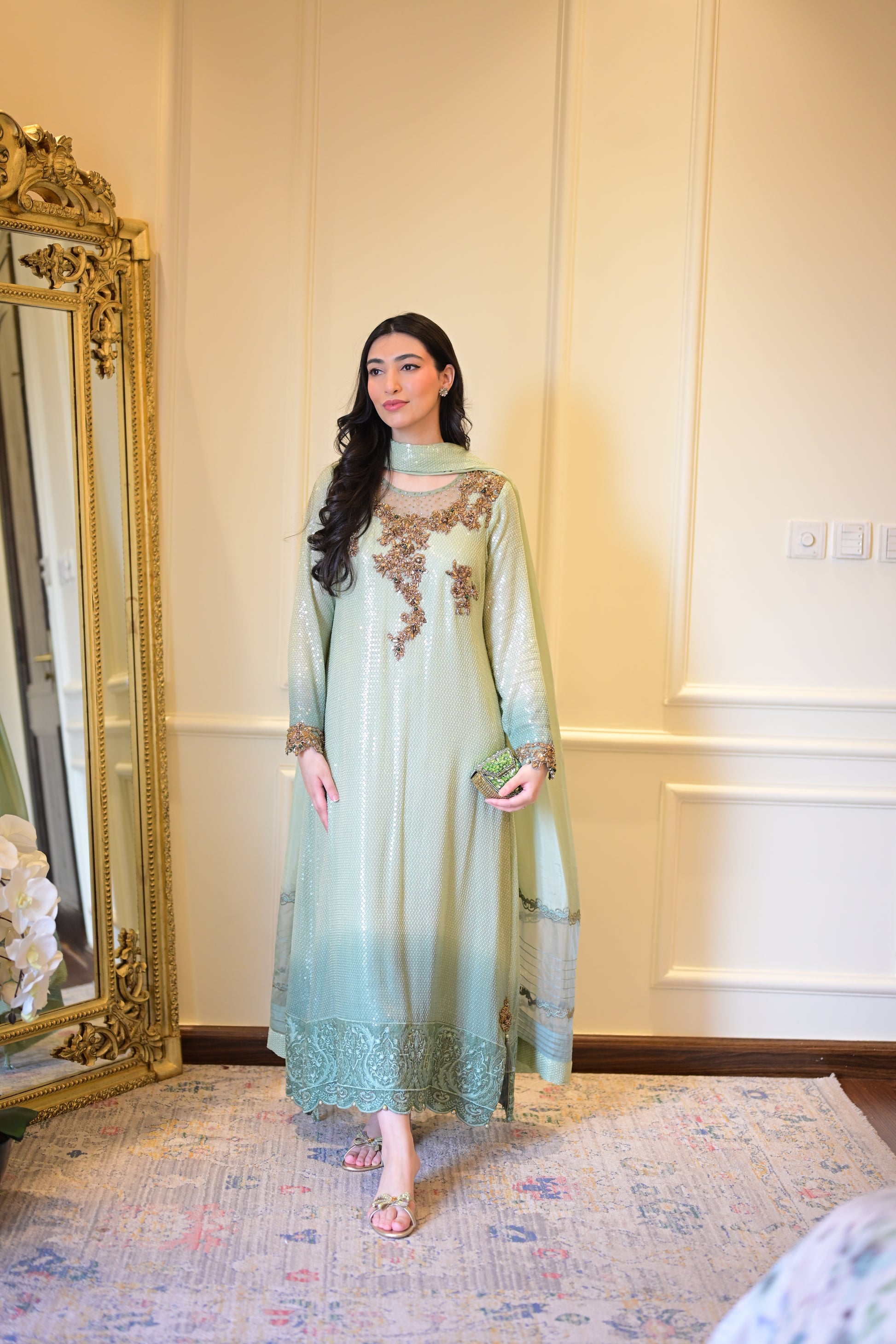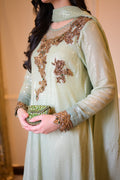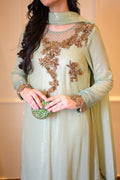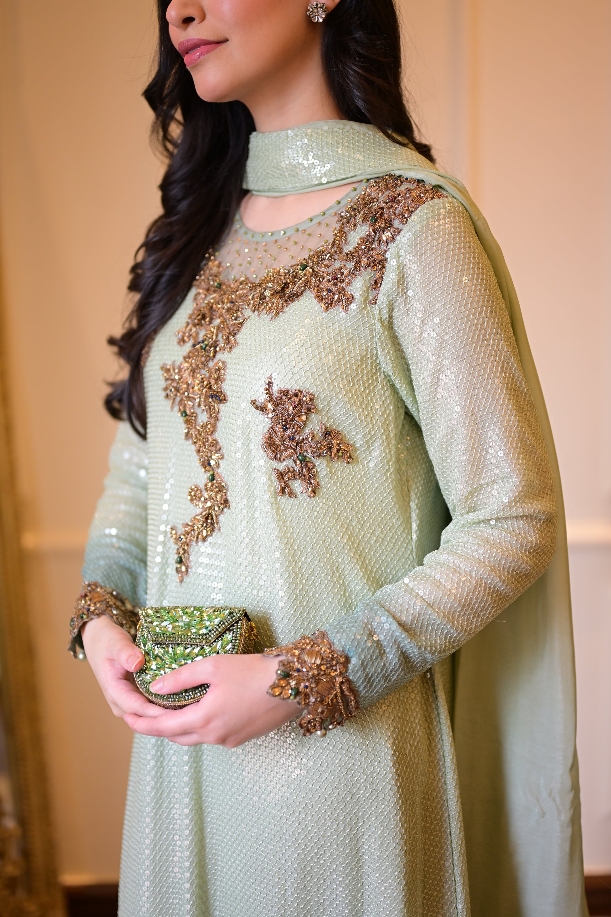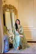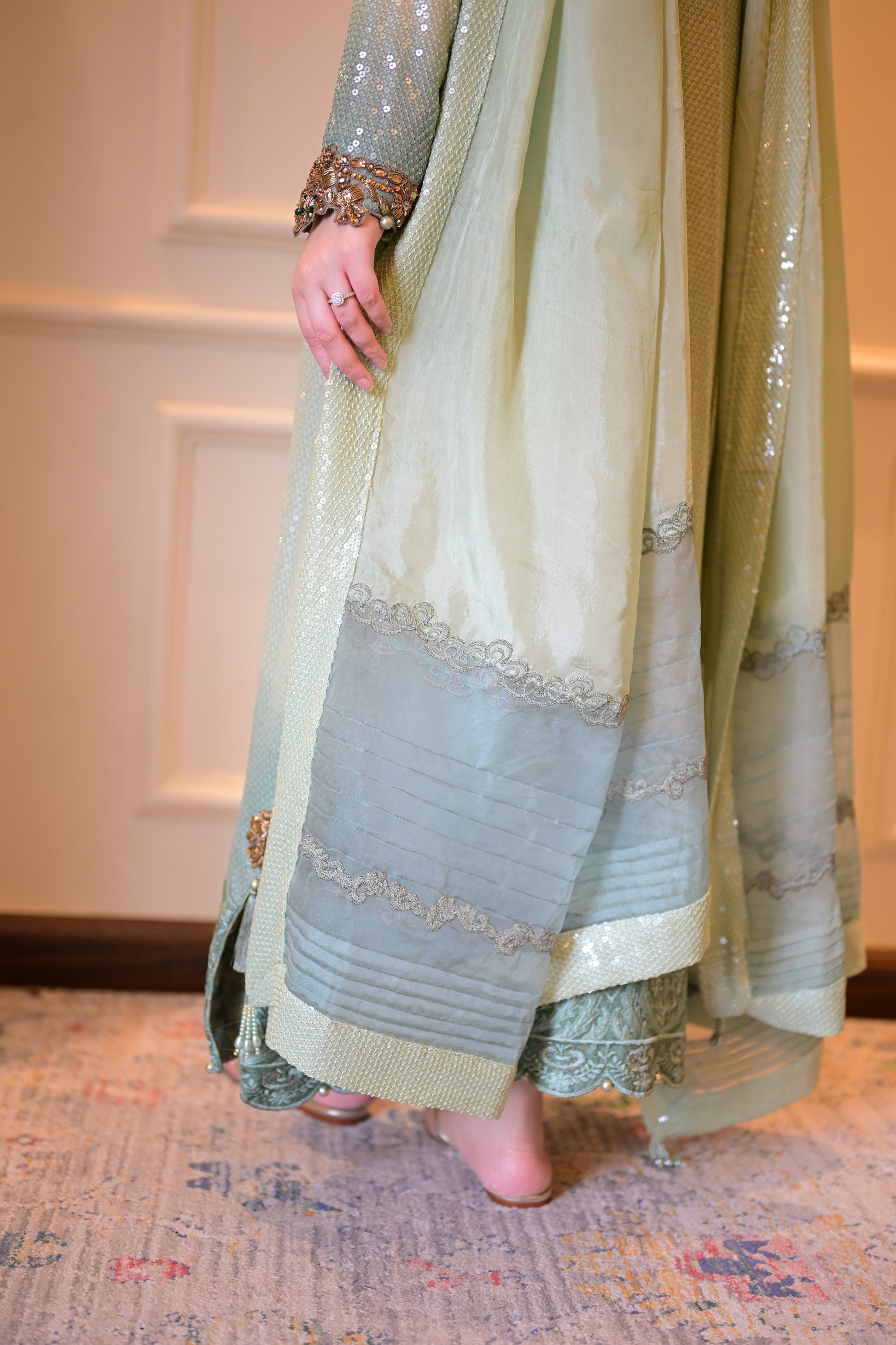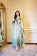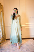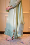 An ombré mint green kaftan-style shirt crafted in chiffon with shimmering sequins — elevated by jewel-toned zardozi, ruby & emerald stones. The embroidered organza hem with pearls, tassel-detailed slits, and a dupatta finished with scallops & pearly drops make Pearl Mint the ultimate festive statement. ☘️