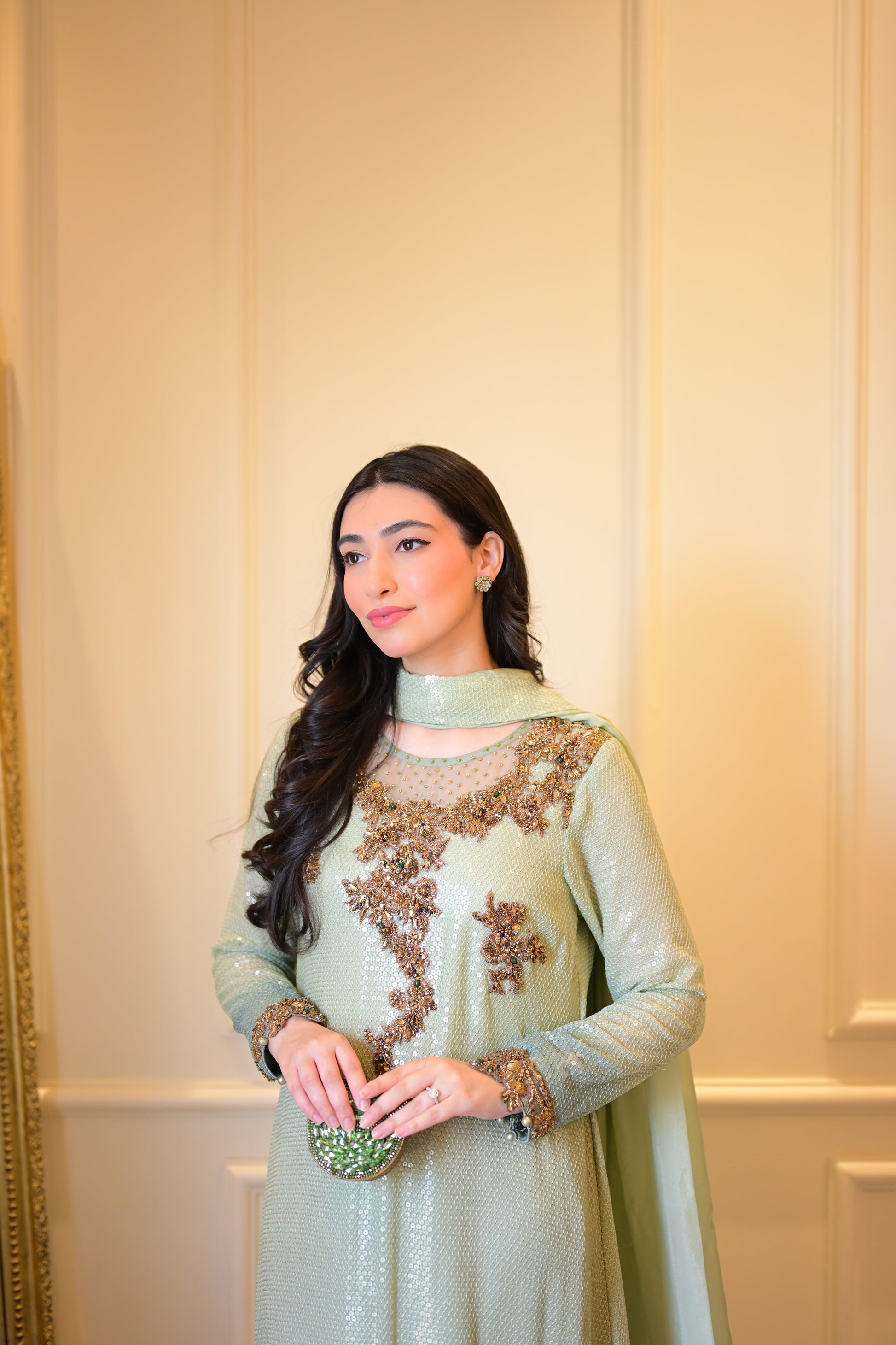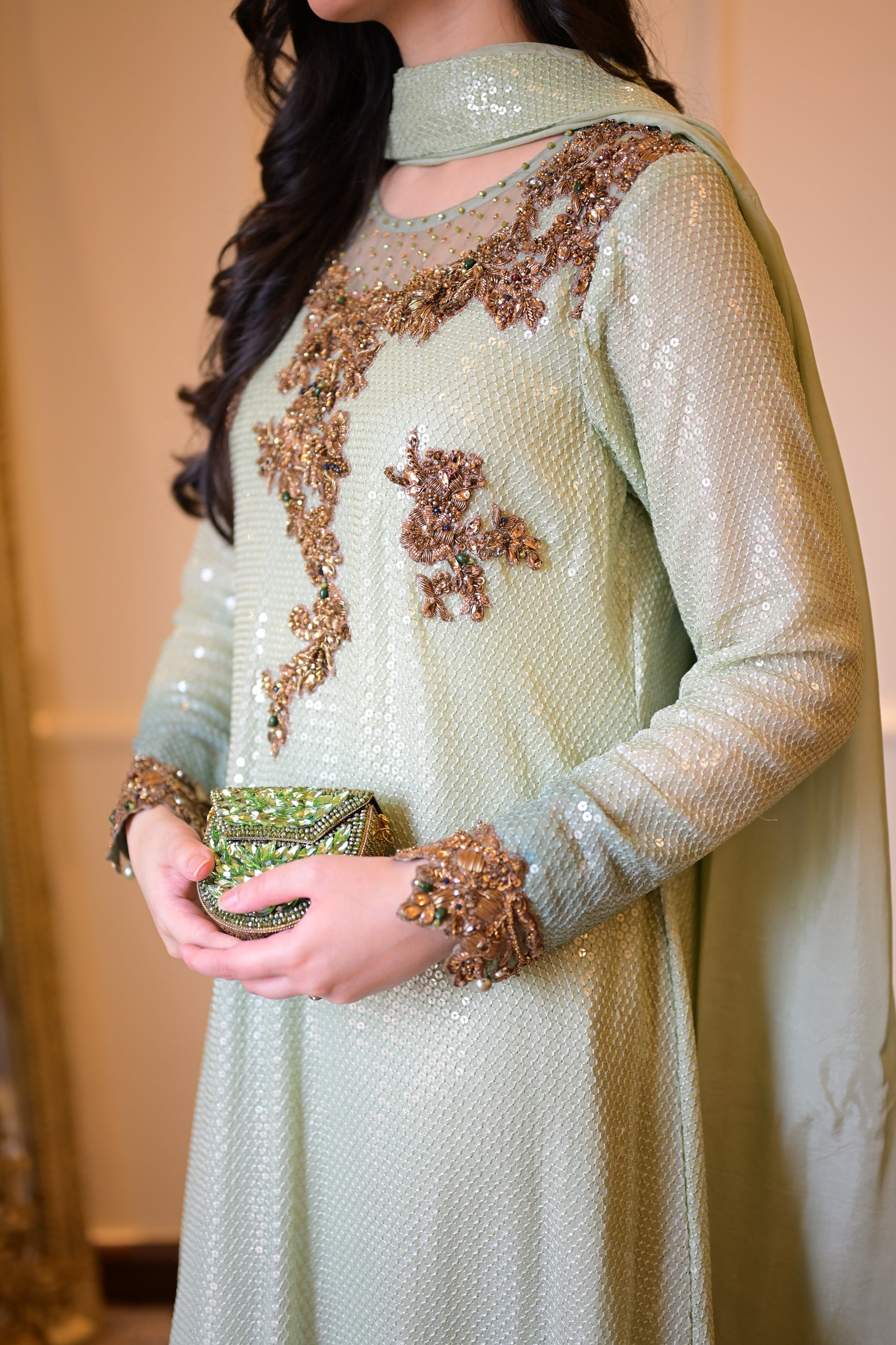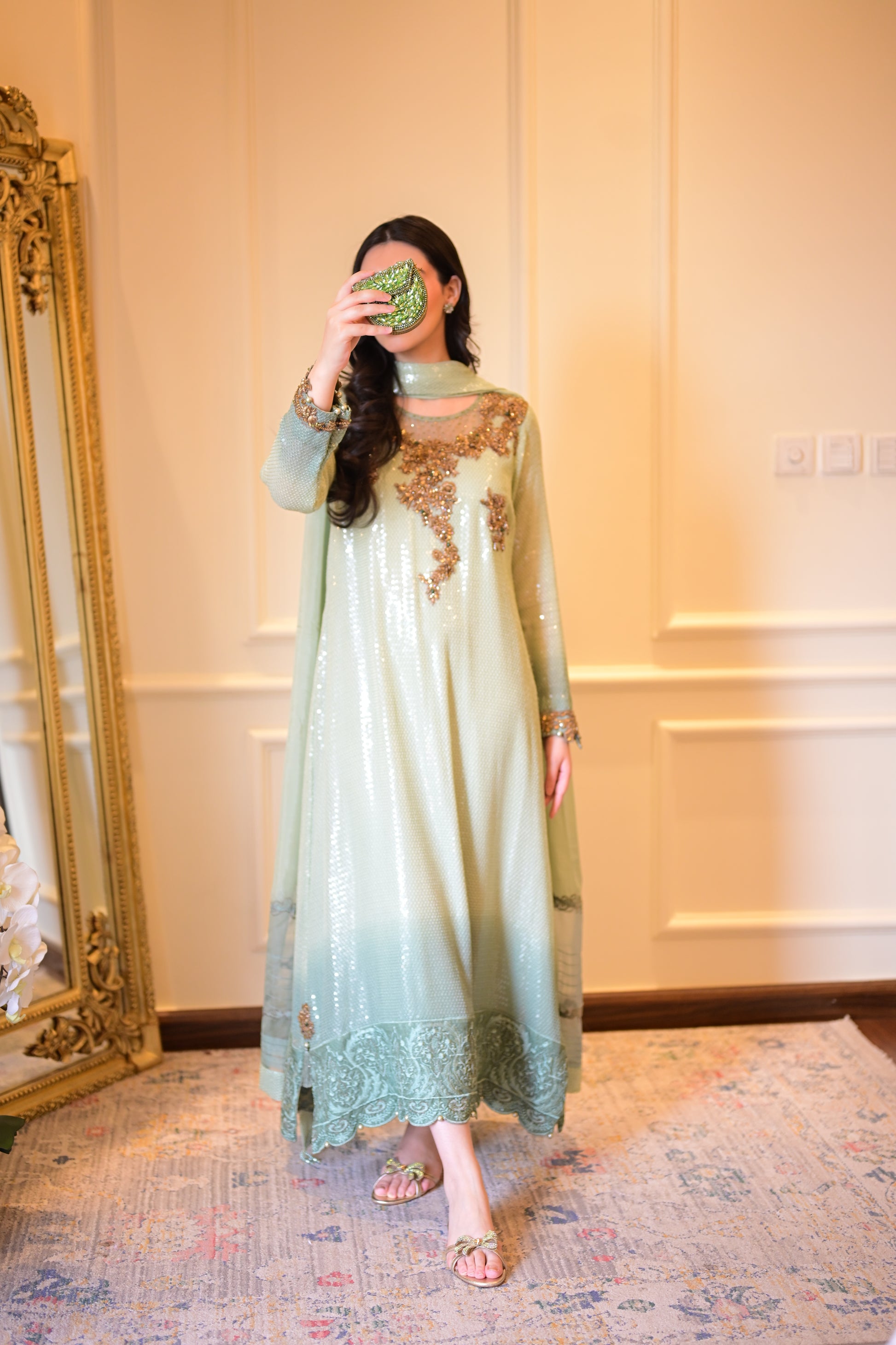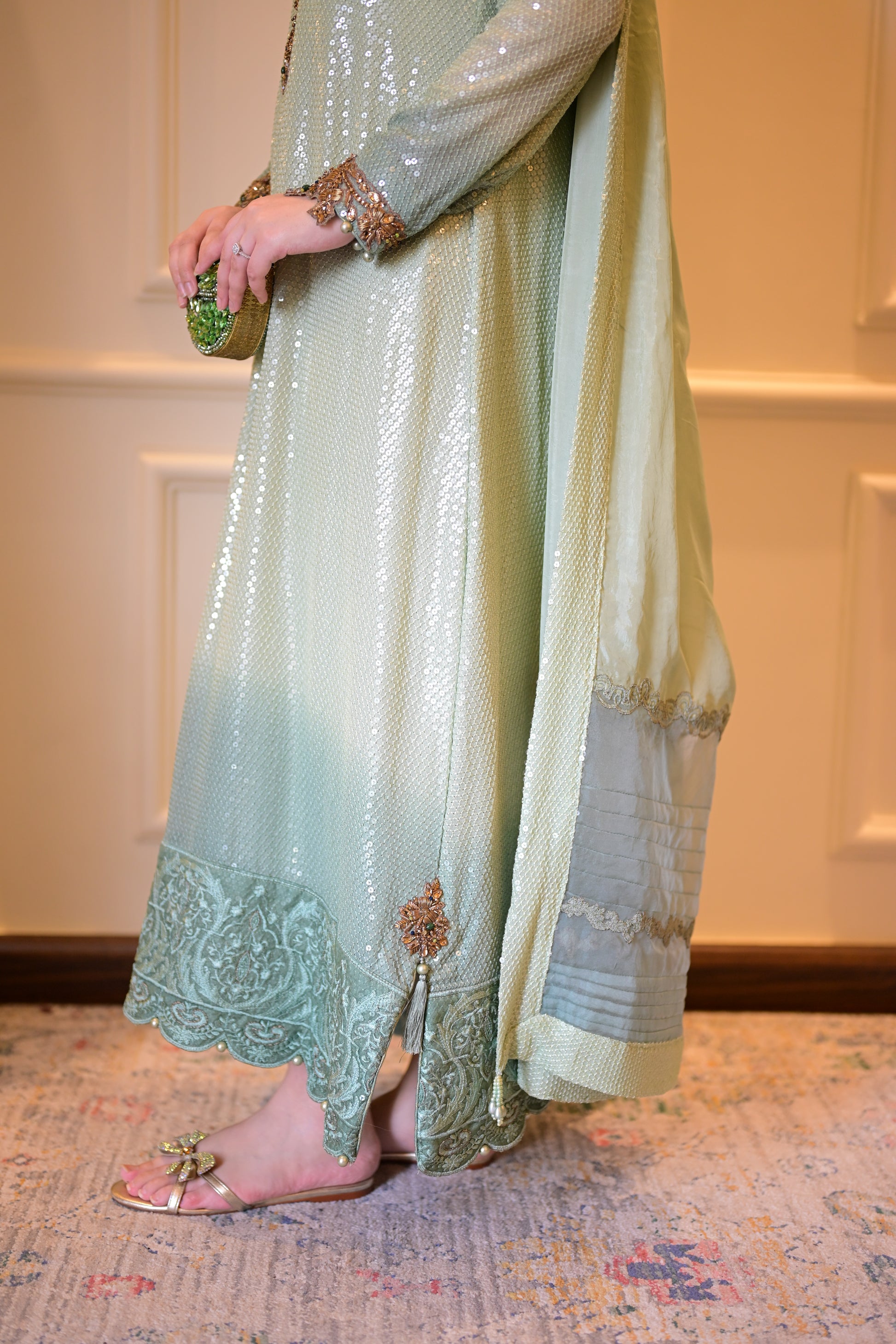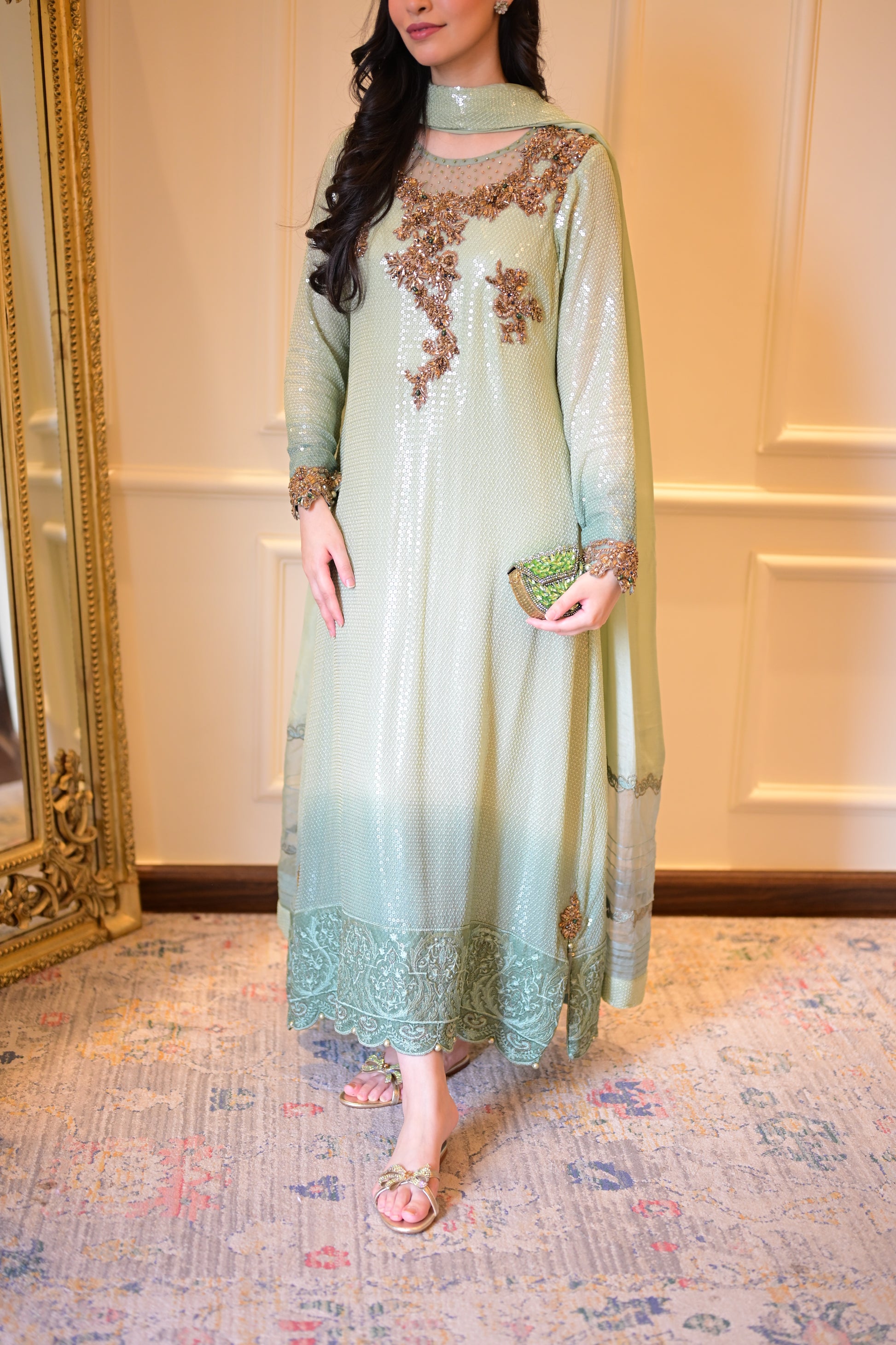 •Ombre mint green chiffon with water-sequins all over
