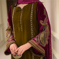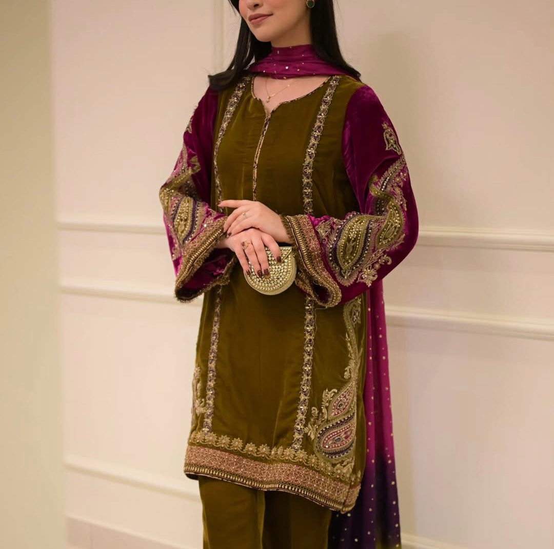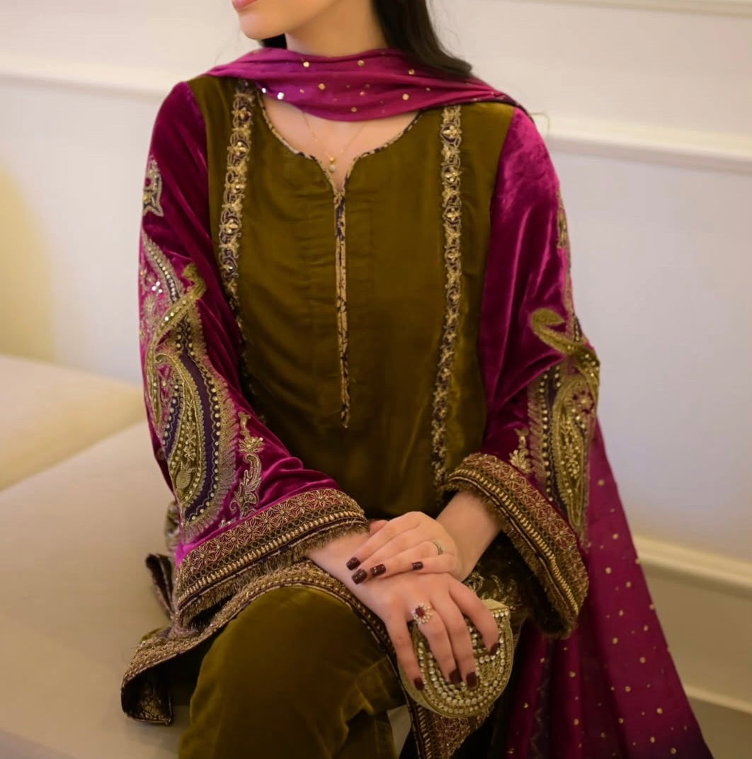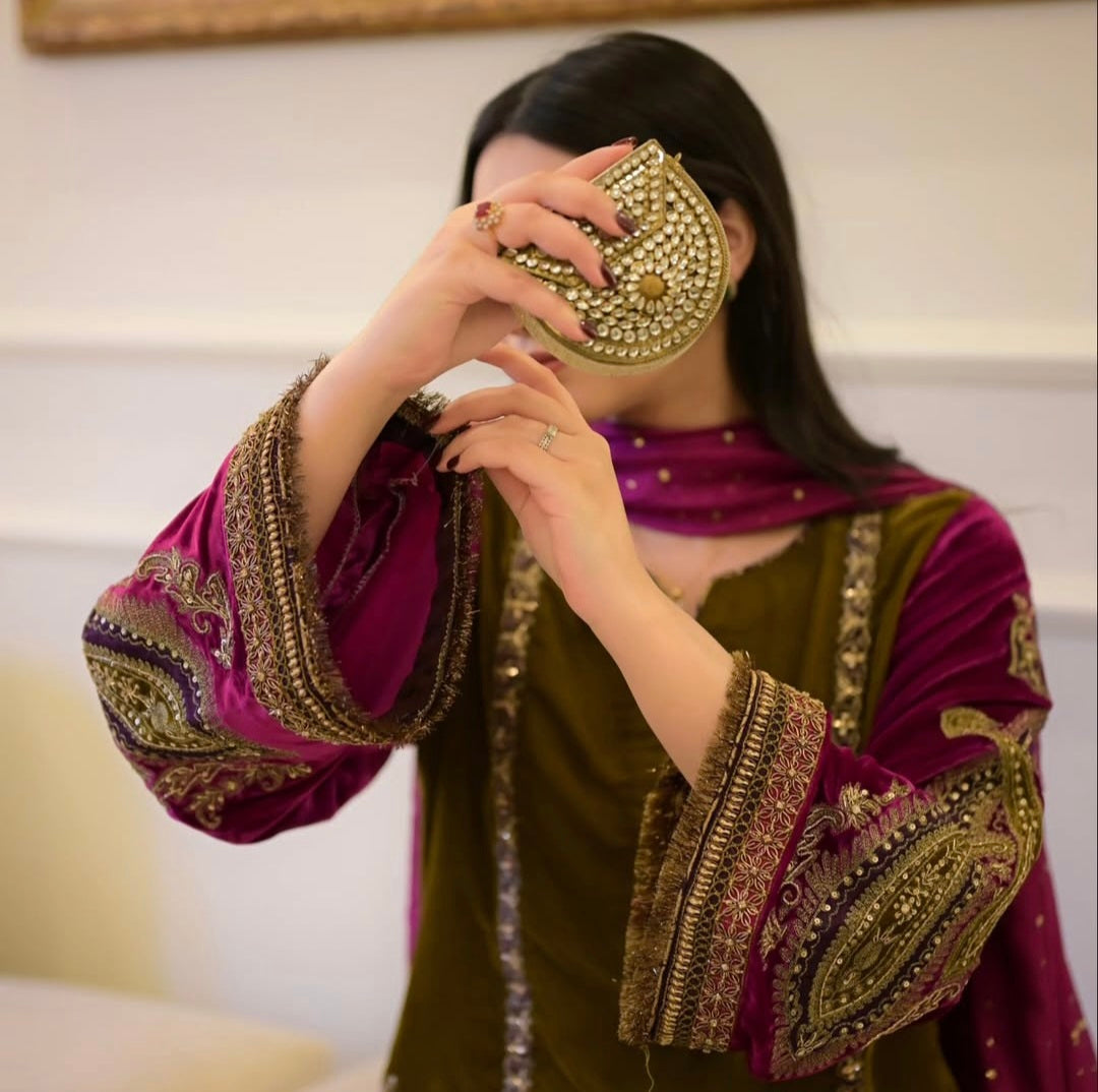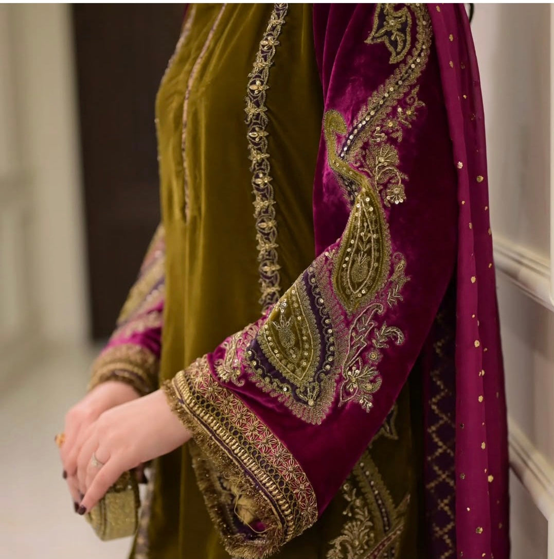 A refined ode to festive grace, Regal Velvet Elegance blends traditional craftsmanship with a rich, modern palette. Designed in a deep olive velvet base, the outfit is elevated with luxurious plum velvet sleeves, intricately adorned with tilla, zardozi, and paisley handwork. The detailed borders and neckline feature delicate embellishment that adds depth, dimension, and timeless charm.