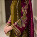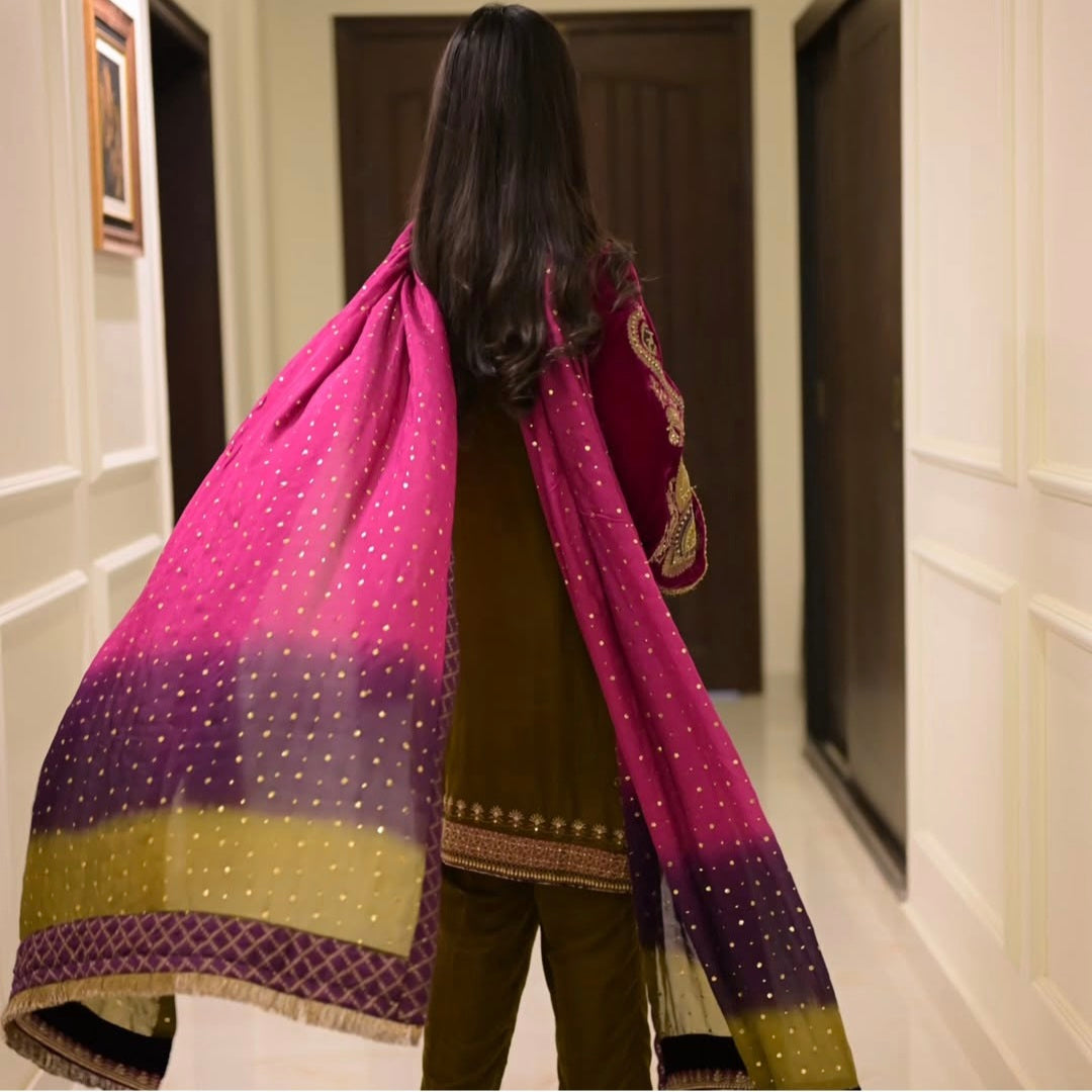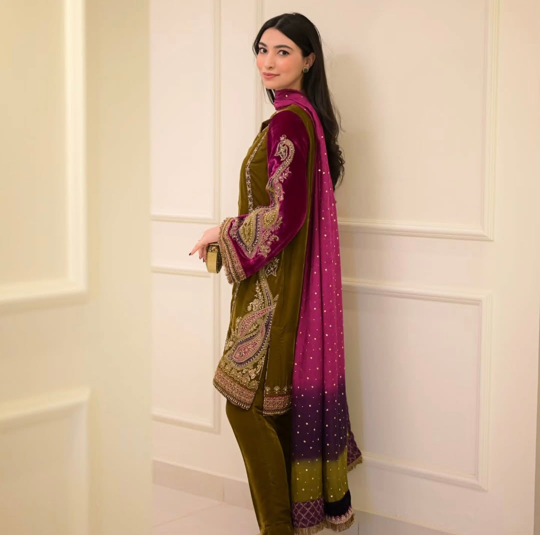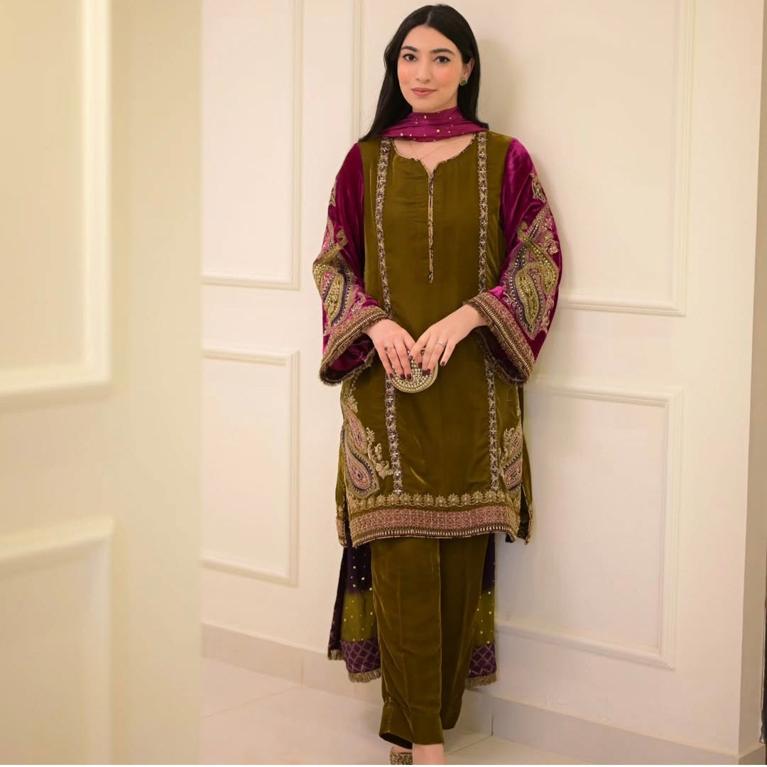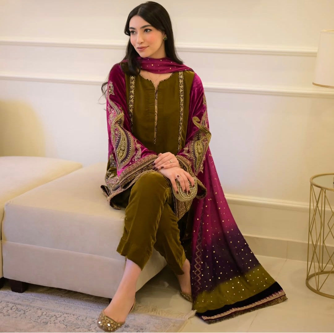 A refined ode to festive grace, Regal Velvet Elegance blends traditional craftsmanship with a rich, modern palette. Designed in a deep olive velvet base, the outfit is elevated with luxurious plum velvet sleeves, intricately adorned with tilla, zardozi, and paisley handwork. The detailed borders and neckline feature delicate embellishment that adds depth, dimension, and timeless charm.